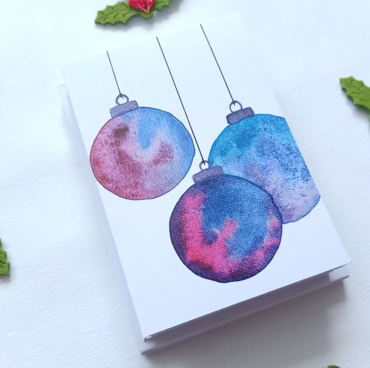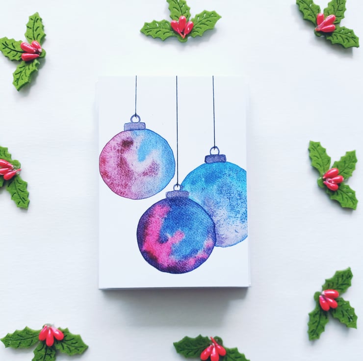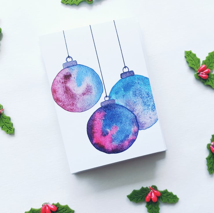 Original watercolour baubles image printed on 350gsm A7 recycled white card.