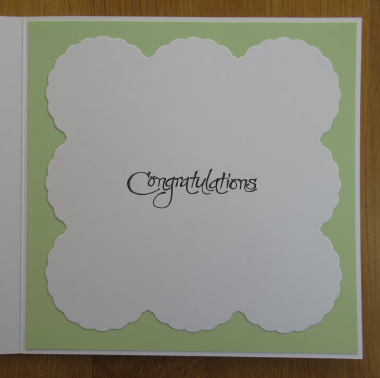 This cute card in tones of green, silver and white features the lovely image of a teddy bear bride and groom. I placed a white and silver, lacy die cut frame behind the image and added an On Your Special Day greeting which has been raised with 3D foam pads. A pretty white organza bow with a fine silver thread running through it has been added to embellish the card. The inside has been finished to coordinate with a stamped Congratulations message.