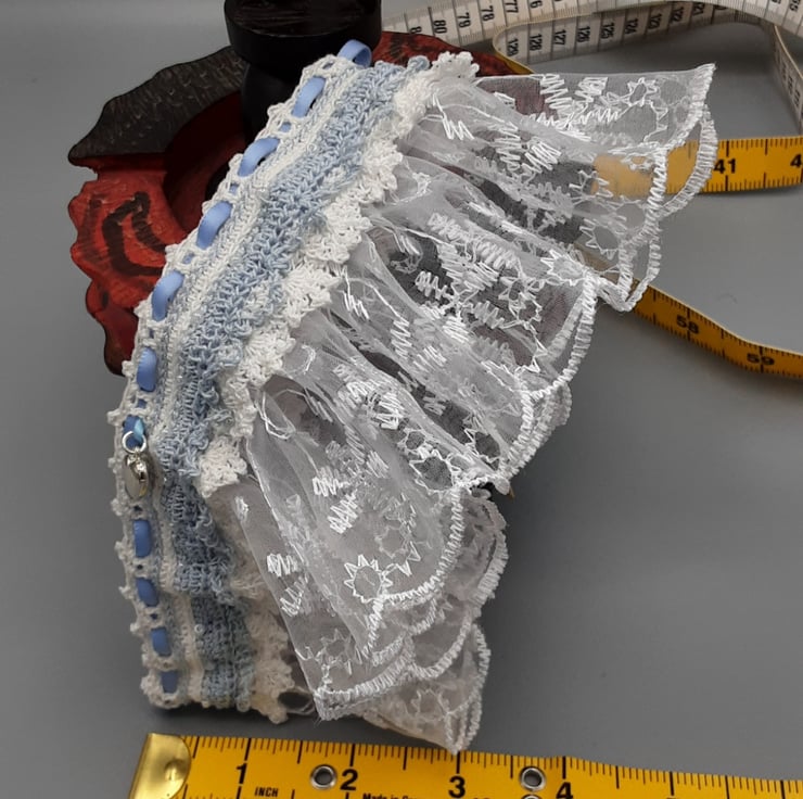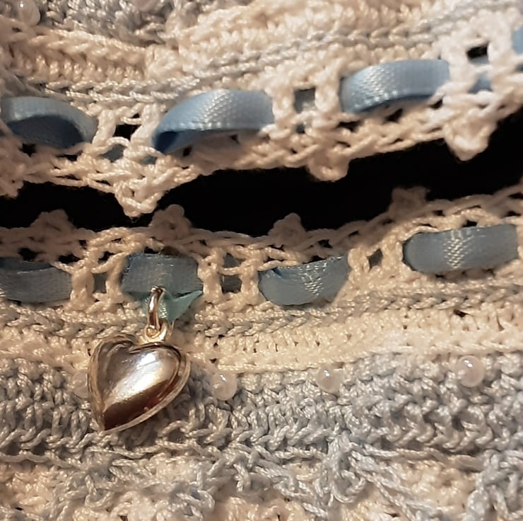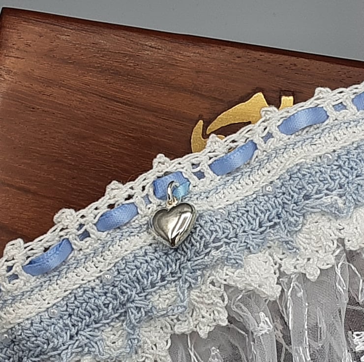 This exquisite hand created garter has been crocheted using the finest quality thread in light blue and white. It features tiny faux pearls and a blue ribbon trim. The little heart charm is sterling silver and adds a sweet extra touch of luxury, as does the lovely white lace. This garter will fit thigh measurement 39cm. Other sizes and colours available on request but please allow four weeks for delivery.