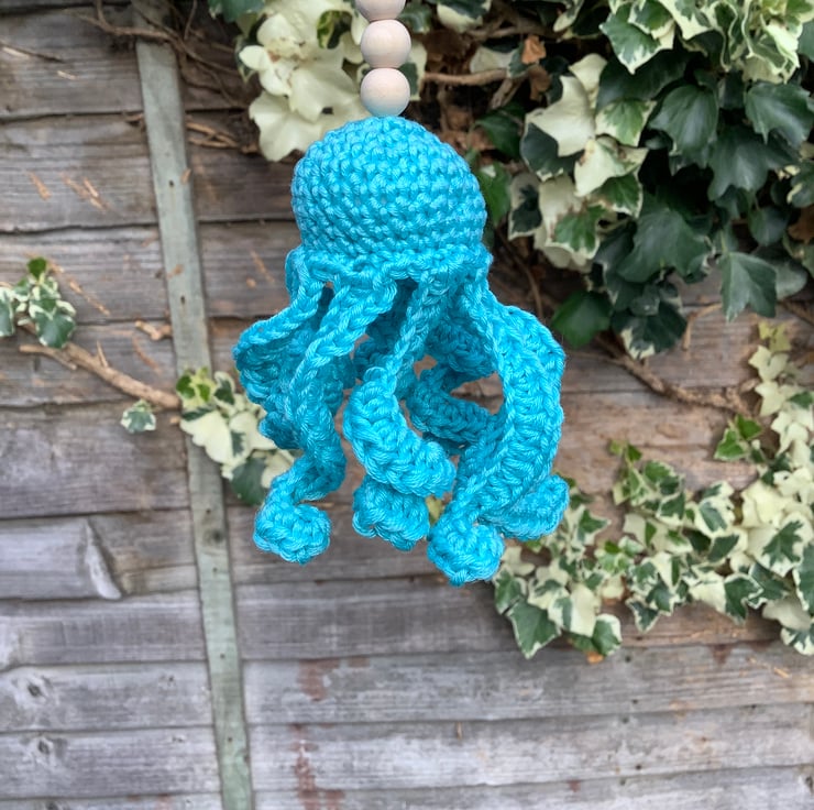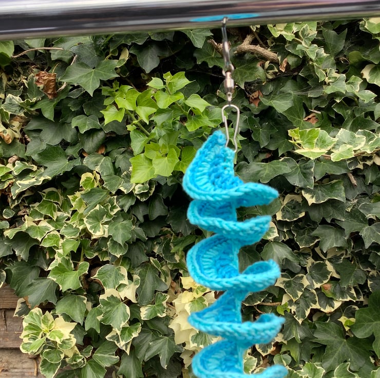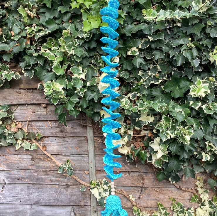 I have crocheted this sea themed wind spinner using a 100% cotton yarn in 2 shades of cotton for the corkscrew spiral and a single shade for the cute little octopus.