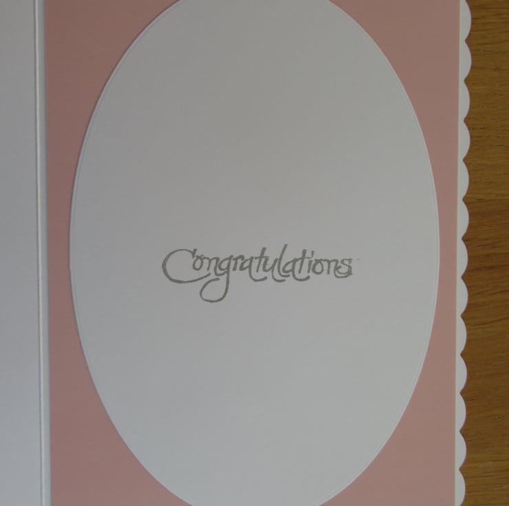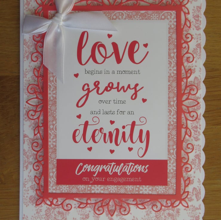 This simple but effective card focuses around the message that 'Love begins in a moment, grows over time and lasts for an eternity'. I have framed the verse/image with a decorative coral frame, which has been die cut by me and raised with 3D foam pads. A white satin bow has been added as an embellishment and the inside of the card has been finished to coordinate.