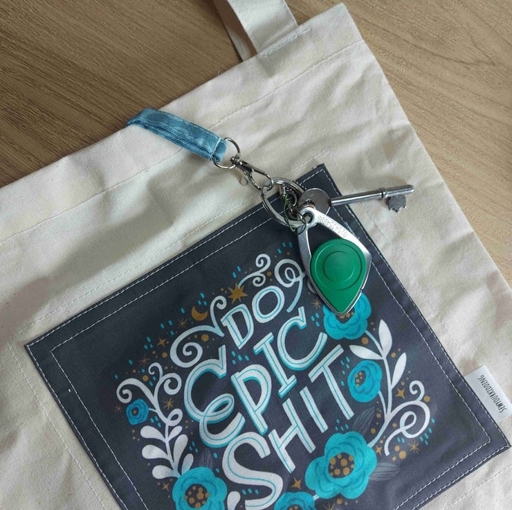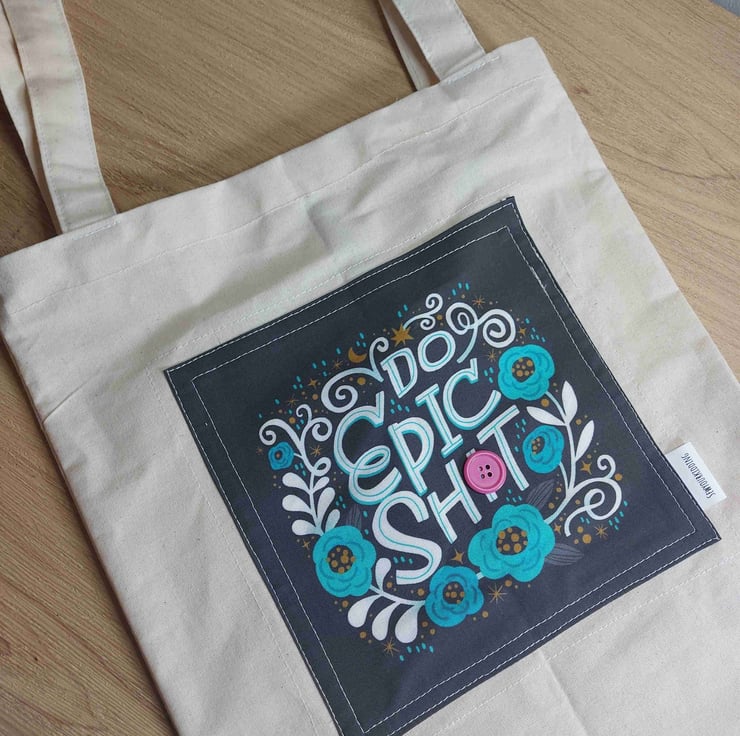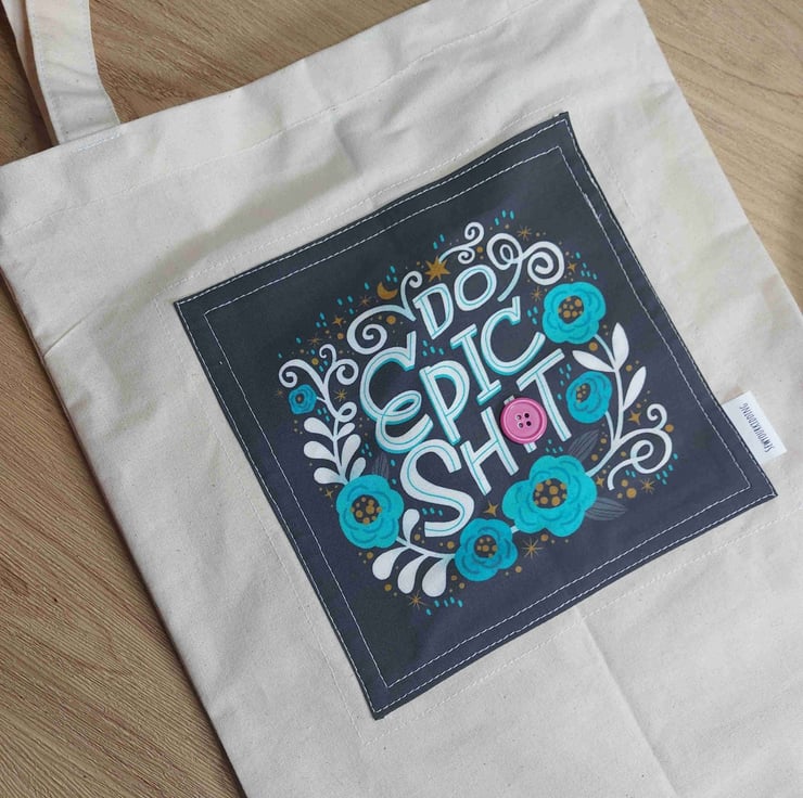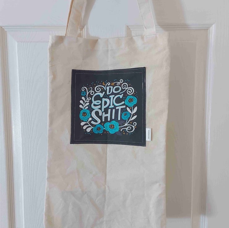 This is a one of a kind calico tote bag with a lovely motivational quote front and centre reading '' do epic sh-t " srounded by beautifull wild flowers these totes make brilliant gifts for your friends and family that like a little sass with their sustainable shopping , inside is a coordinating key clip so we can avoid those moments when we are rooting around the bottom of our bags hunting for them .