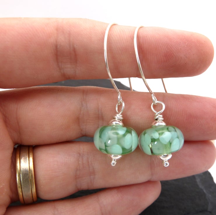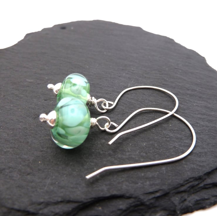 A pair of earrings made with handmade sterling silver ear wires, sterling silver beads and handmade lampwork glass beads.