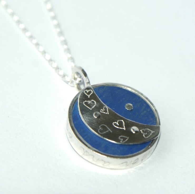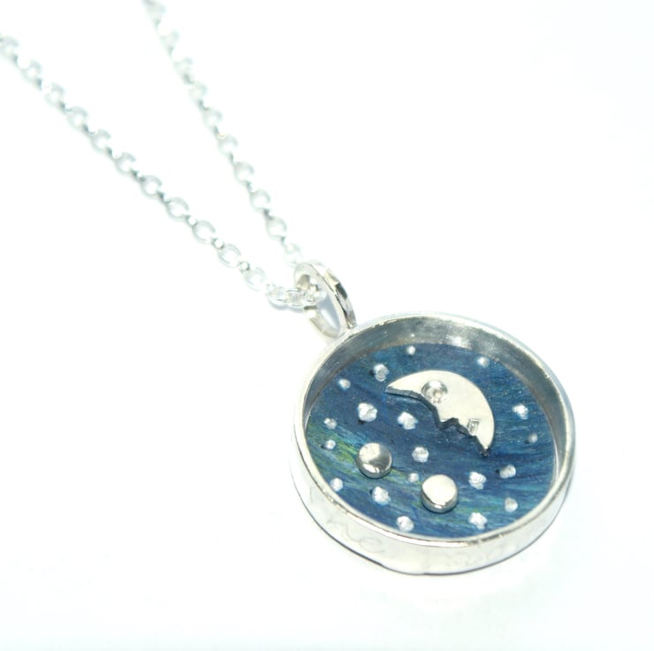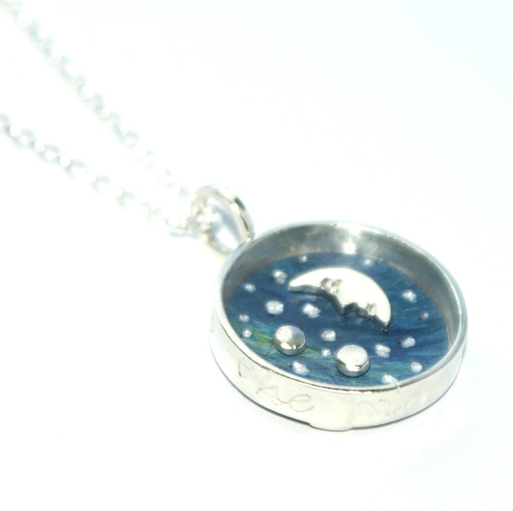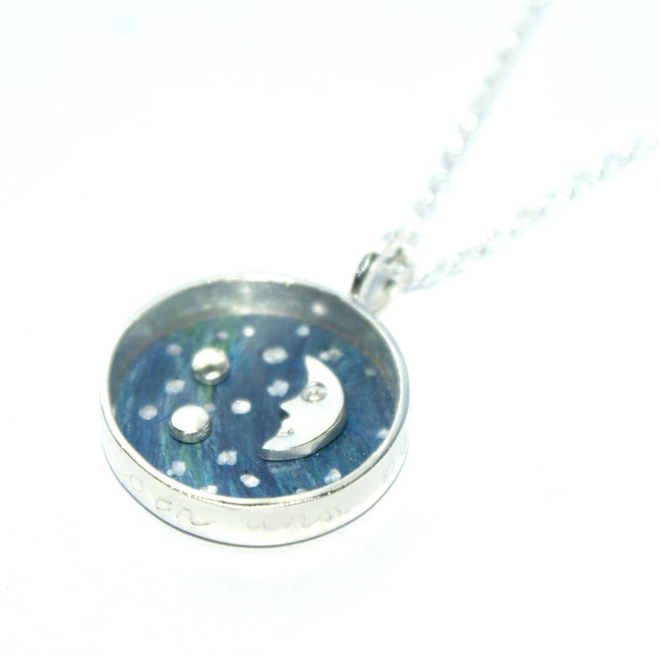 A cute framed necklace featuring a little silver moon in the the night sky. The background is made from anodised aluminium which has been hand painted and little silver dots added to look like stars. The scene is set inside a sterling silver deep circle with 'to the moon and back' engraved around the outside. There are little hearts engraved on the reverse. Hung from an 18 inch sterling silver chain (Please message me if you prefer a different length).