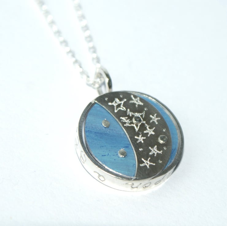 A cute framed necklace featuring a little silver star in the the night sky. The background is made from anodised aluminium which has been hand painted and little silver dots added to look like smaller stars. The scene is set inside a sterling silver deep circle with 'wish upon a star' engraved around the outside. There are little stars engraved on the reverse. Hung from an 18 inch sterling silver chain (Please message me if you prefer a different length).