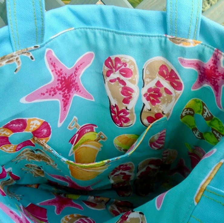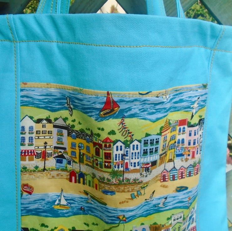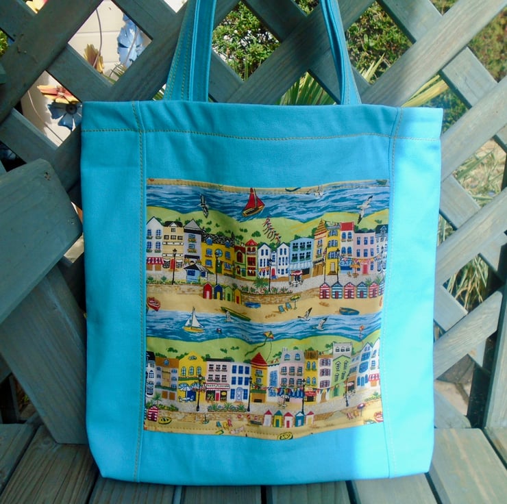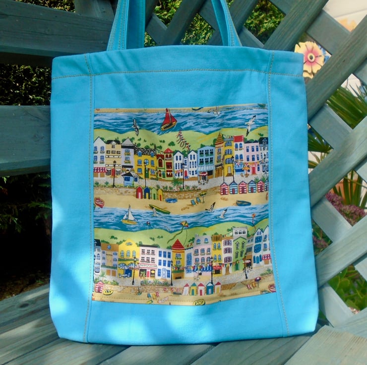 Made in a lovely cotton twill fabric , and a pretty beach scene fabric on the front