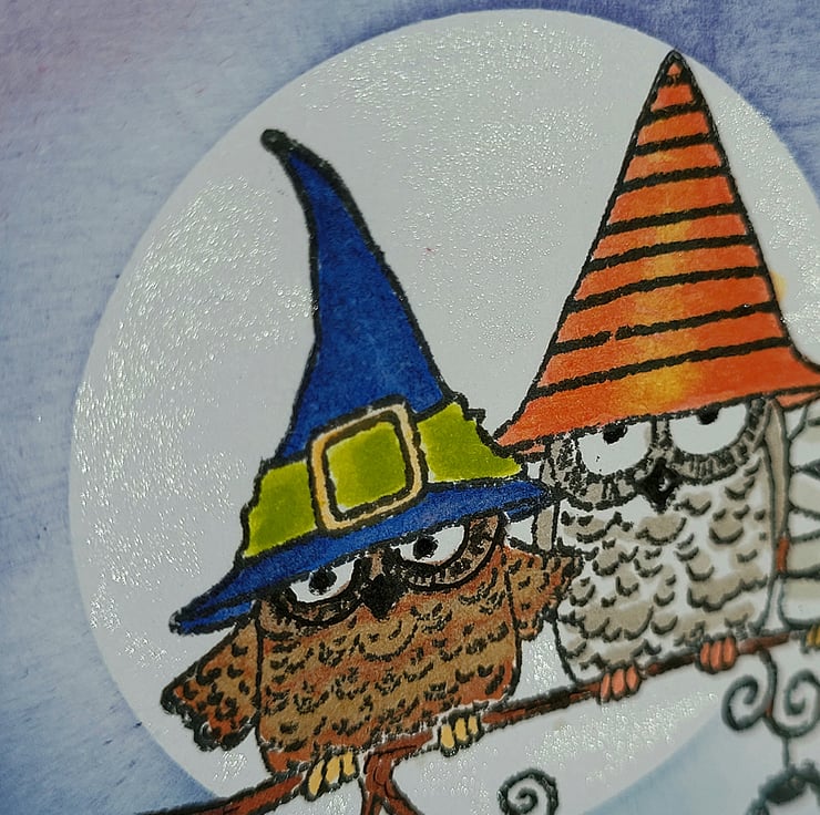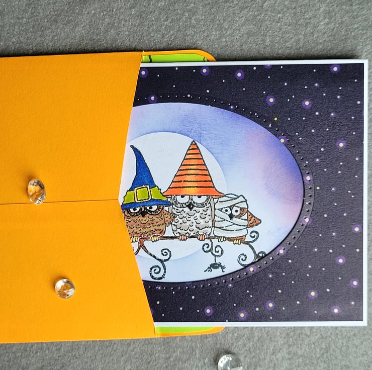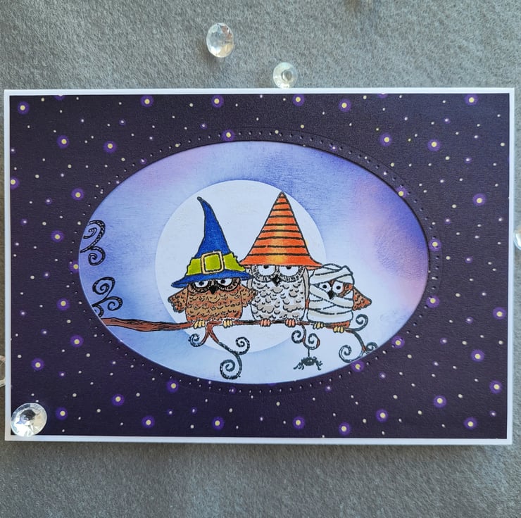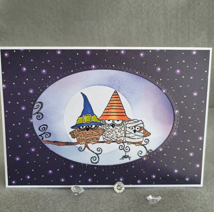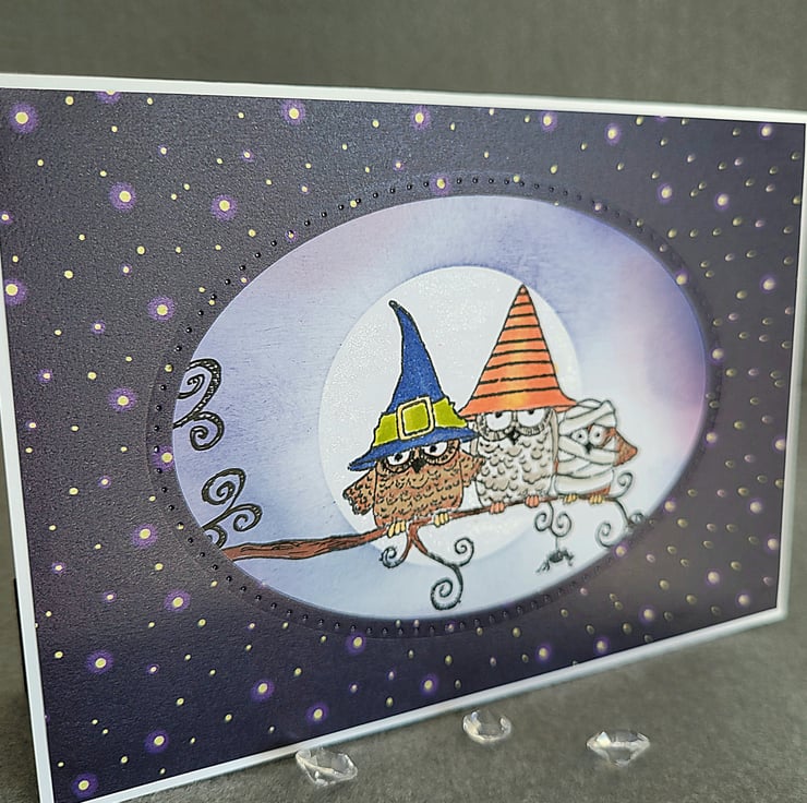 The card base is made from quality white recycled card and is layered with a white panel which features hand-stamped and coloured fancy dress owls and a shimmering moon. I masked the owls and added a moon and clouds in a night sky behind them, using inks and shimmer pen on the moon. On top of this is a frame of starry patterned paper and a die cut oval. The inside is white with a narrow border of matching patterned paper and a small stamped sentiment which says "BOO".