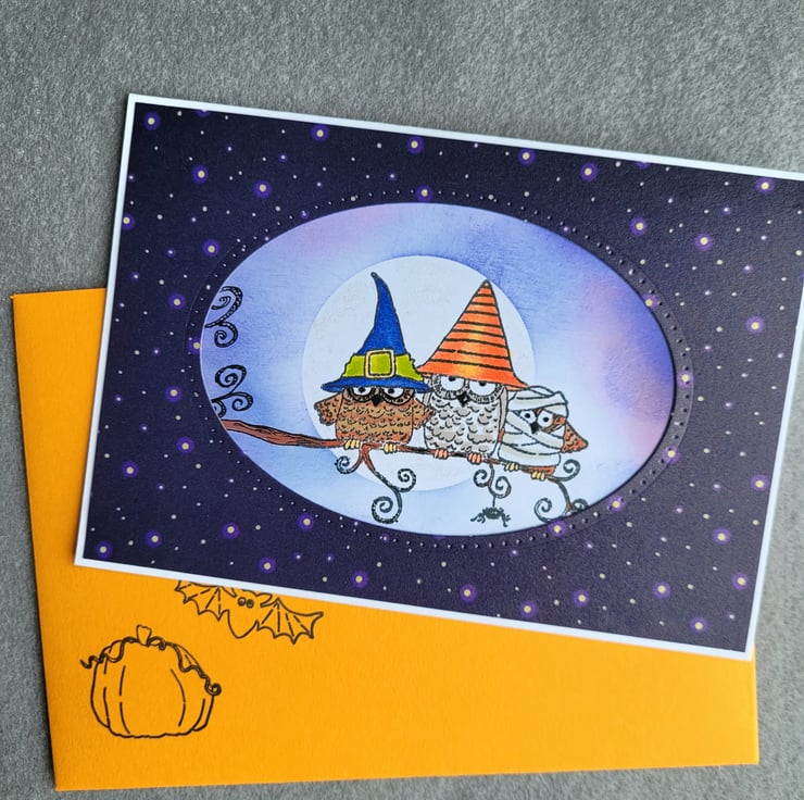 A fun handmade layered greeting card featuring Owls wearing fancy dress! Guaranteed to raise a smile, it is suitable for a birthday, as a thank you or note card or 'just because'! The card measures 10.5 cm x 15 cm and comes supplied with a handmade envelope in pumpkin orange. The inside has small stamped sentiment with ample white space for a personal message.