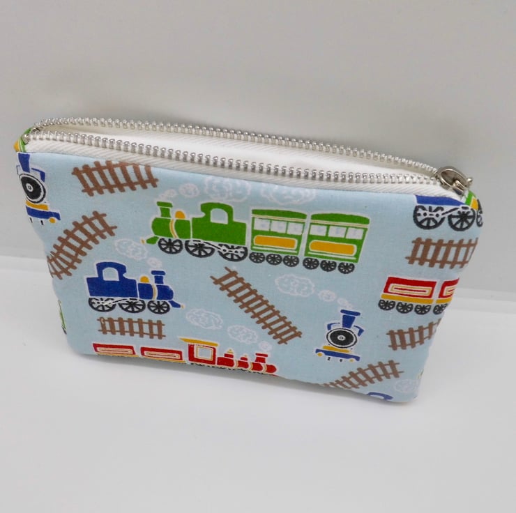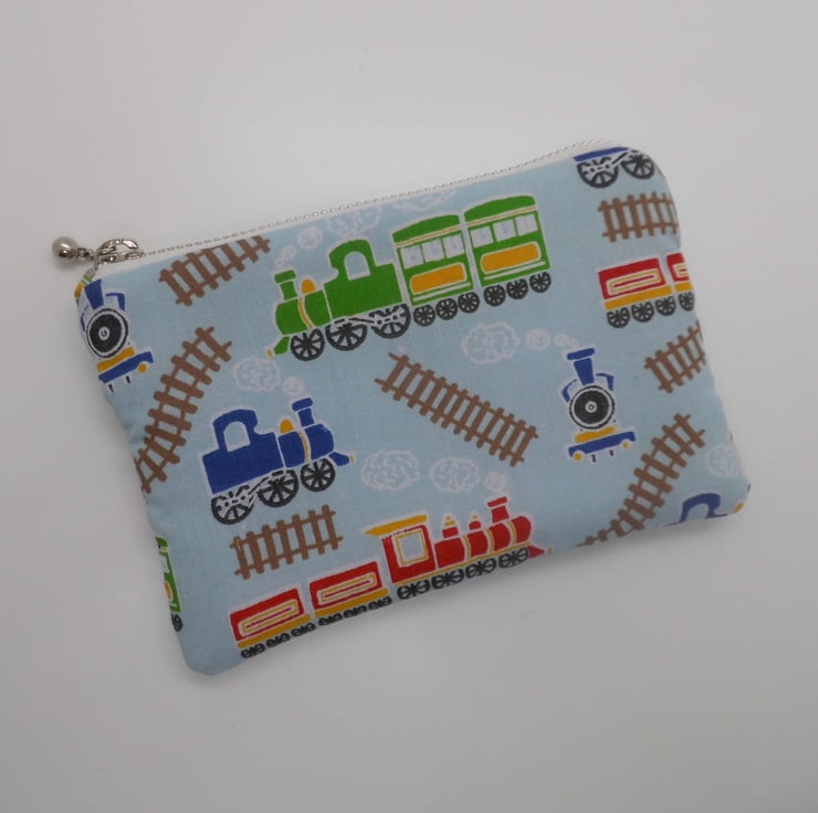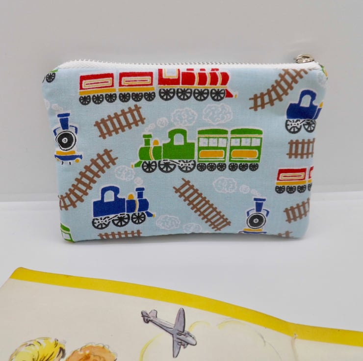 Here is a cute little purse made with a fun poly/cotton print. The fabric has a blue background and is printed with colourful trains. It measures 15cm x 10cm. Use as a coin purse, small makeup bag, etc.