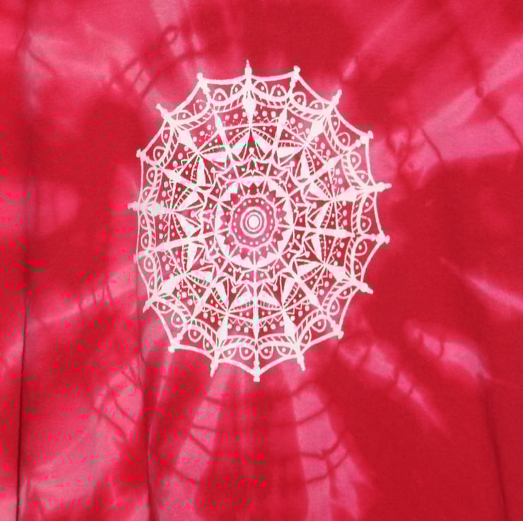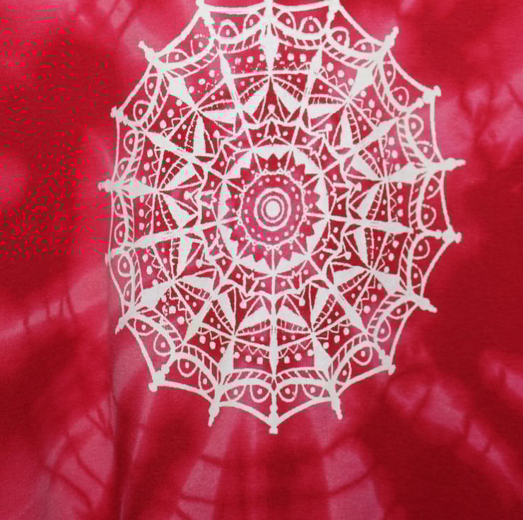 The colours of the top are red, pink target tie-dye, with a white Mandala print.