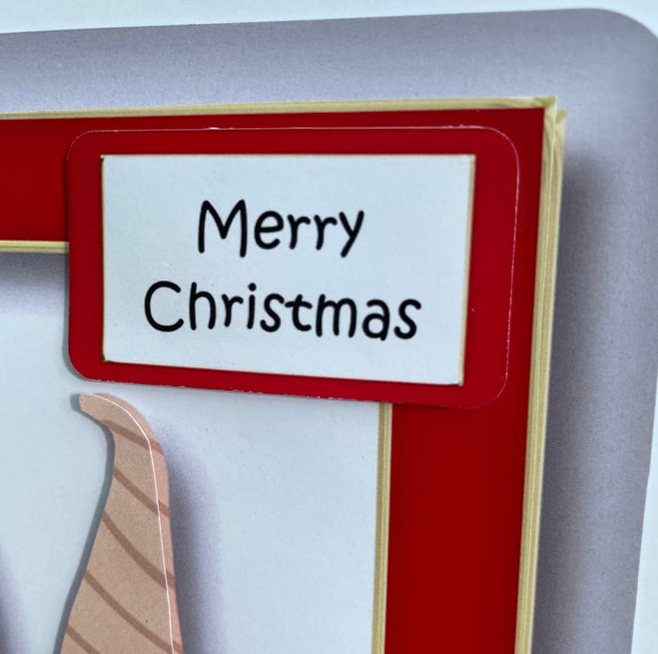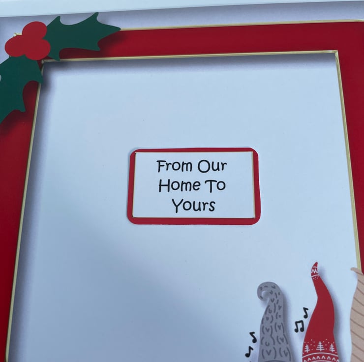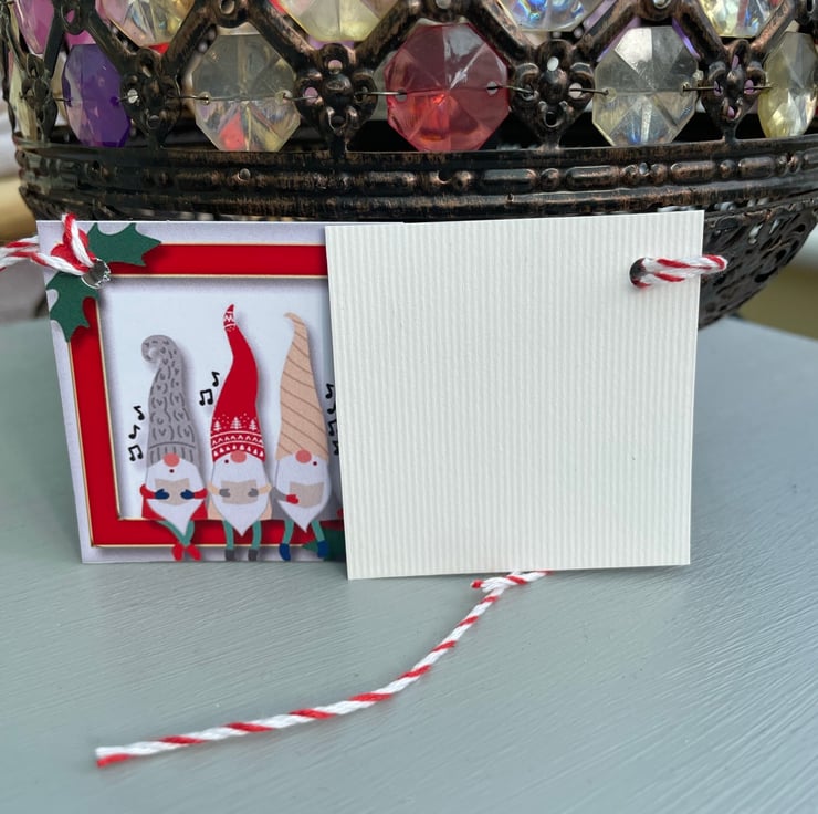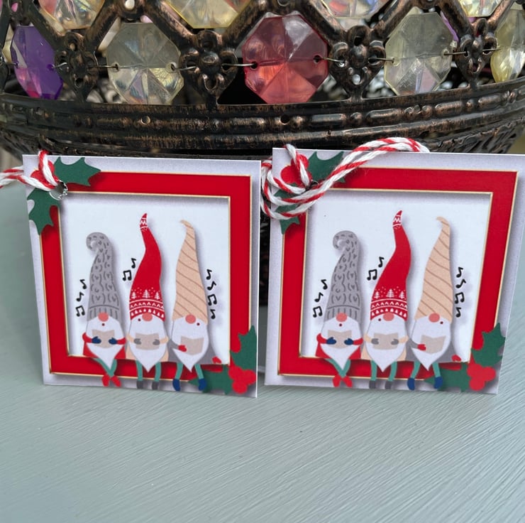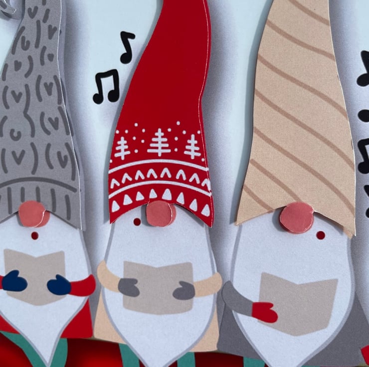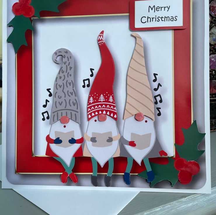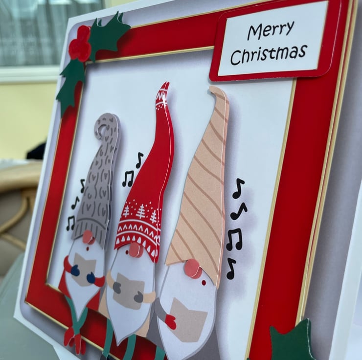 For the Gnome obsessed, a bit of fun for christmas. This 20x20cm (approximately) card is full of fun. It features 3 gnomes sitting down and singing, hopefully something fun and christmassy! They all have different knitted hats on.The design is decoupage to give it dimention and is finished with holly decoration. The greeting says Merry Christmas. Inside has a matching insert which has the greeting From our home to yours. Jolly good christmas fun. The card comes with 2 matching gift tags.