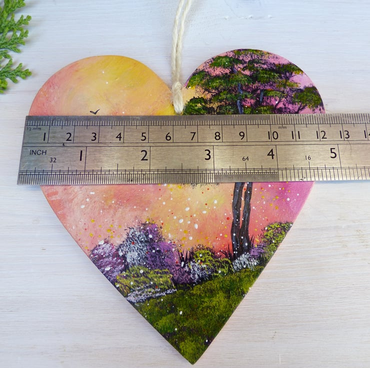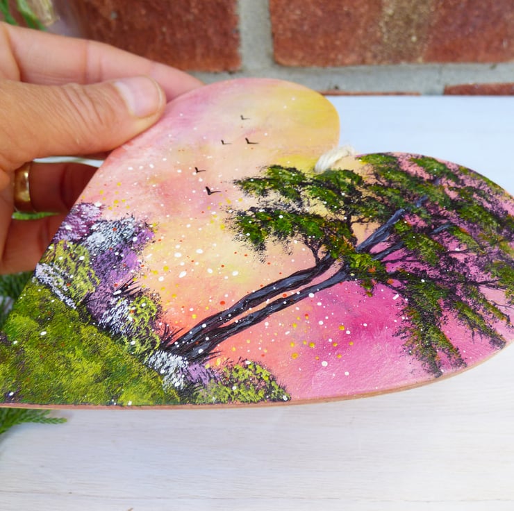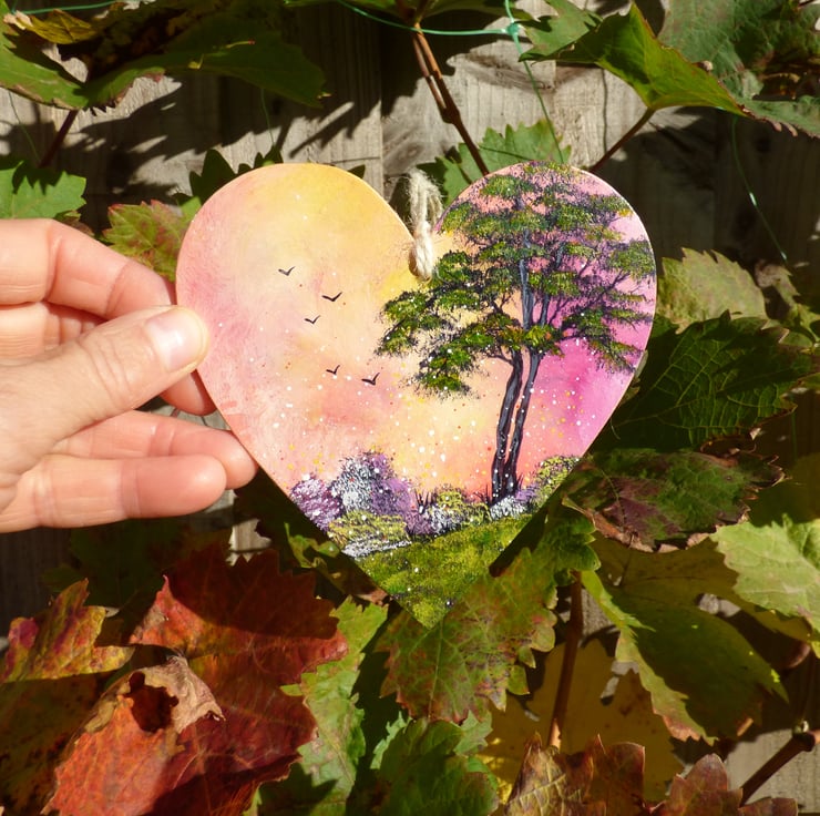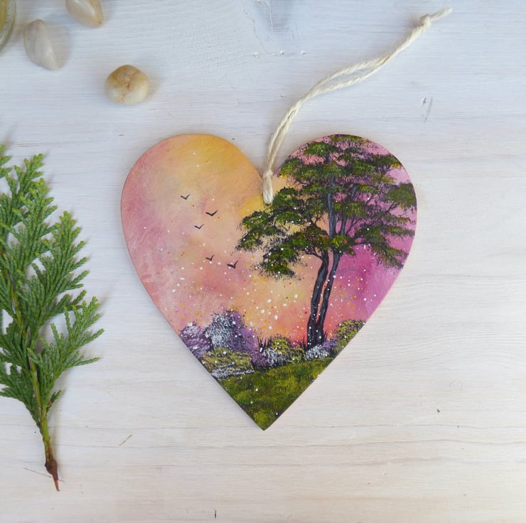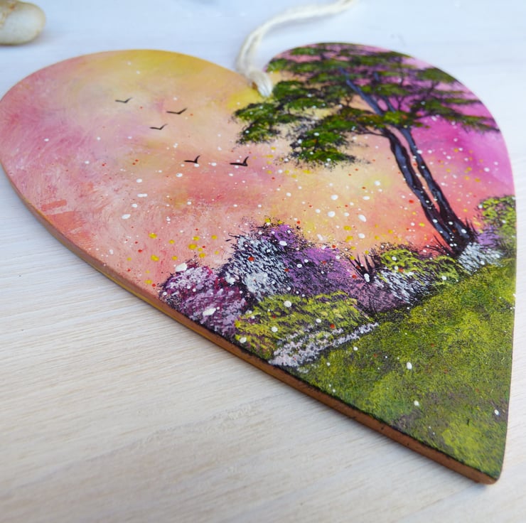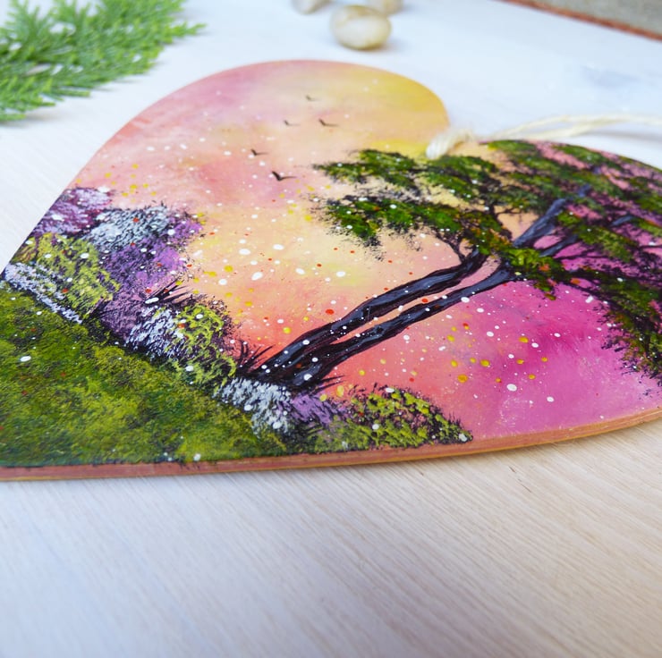 A lovely colourful fantasy hand painted wooden hanging heart. This is an original acrylic painting of a beautiful colourful sky and a tree painting with flying birds in the distance.