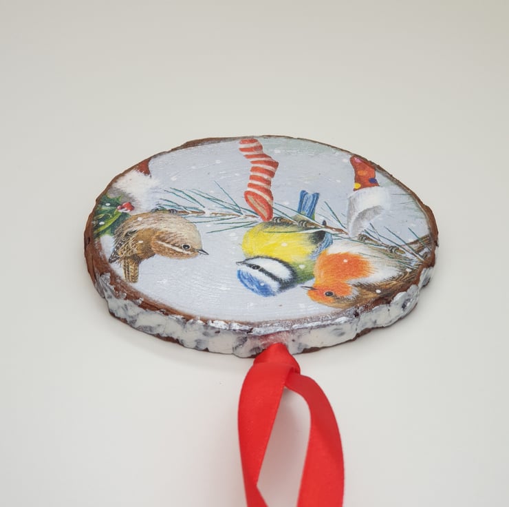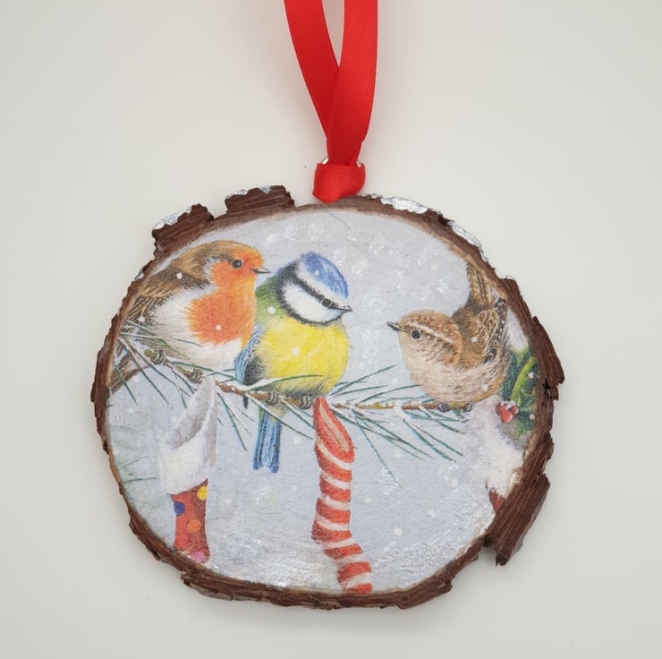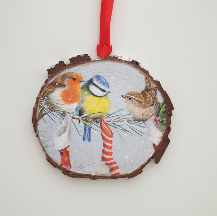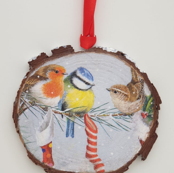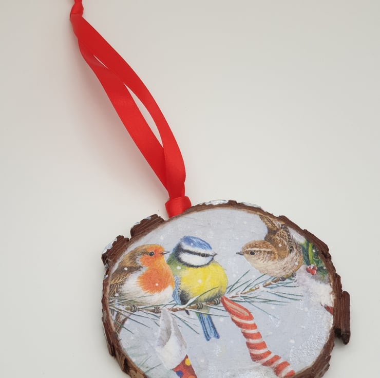 Pretty garden birds in the snow Christmas hanging wood slice to brighten up your Christmas decor. The wood slice has been decoupaged with a garden bird design and white metallic paint has been applied to the top edge to give the affect of snow. Several layers of satin varnish have been applied to the decoration for protection, and a metal loop has been screwed into the top with red satin ribbon attached ready to hang. This decoration would look lovely hung in a window, on the Christmas tree, from a door handle, knob or shelf, etc and would make a lovely gift.