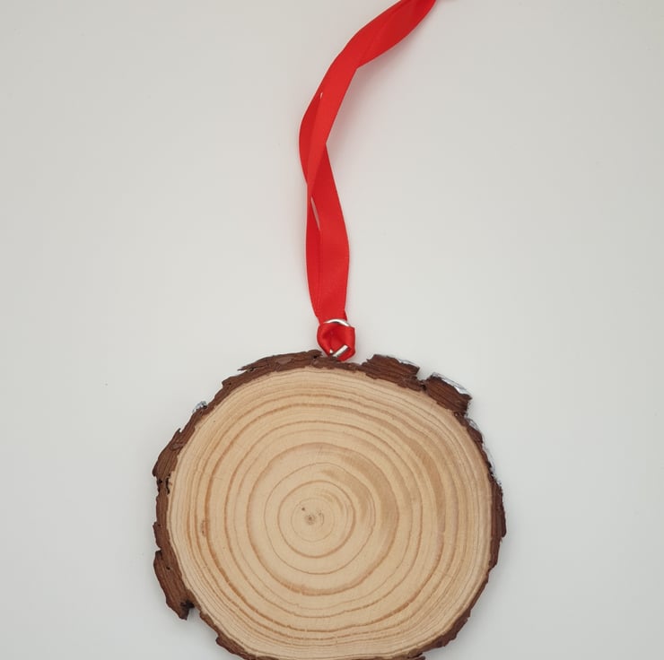 Size of wood slice without metal loop and ribbon: 10 cm diameter x 1 cm depth approx