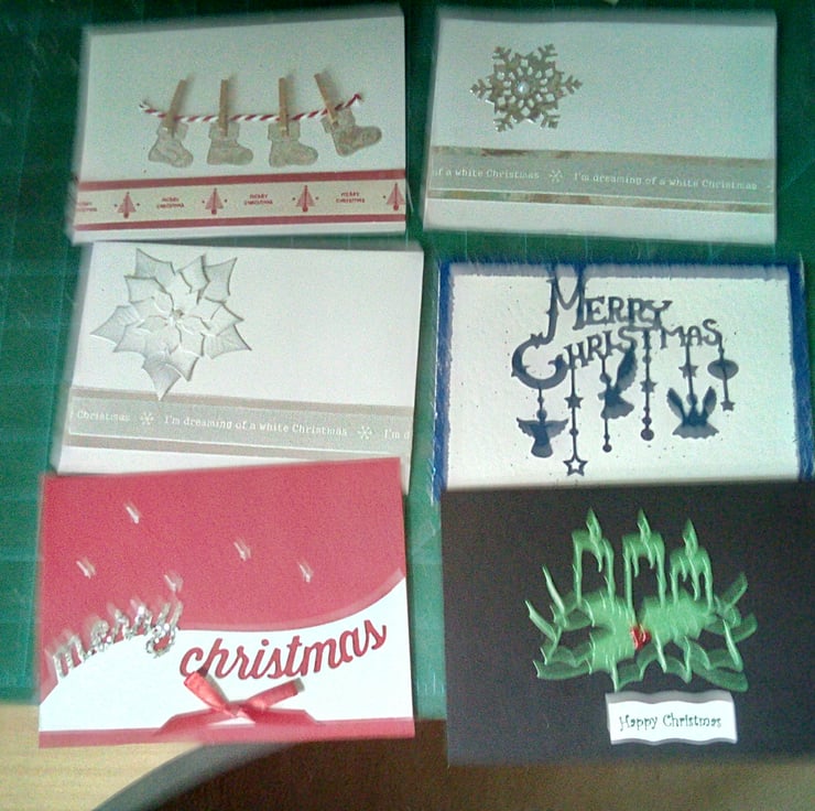 Handmade and uniquely designed packs of 6 cards. 6 different designs all with paper inserts. Stockings, snowflakes, candles, poinsettia are included.