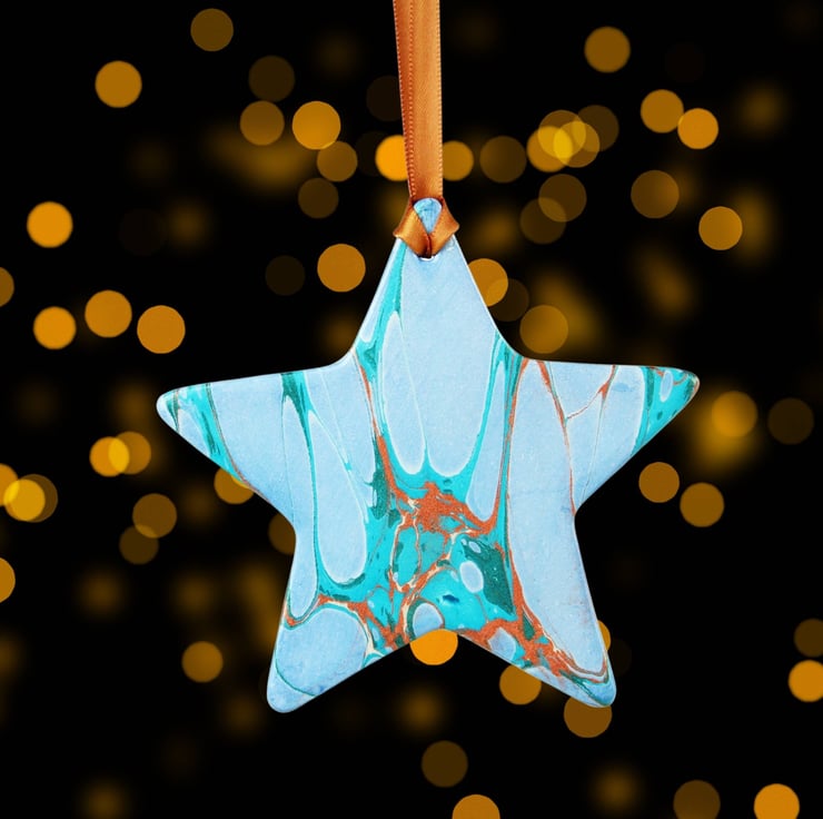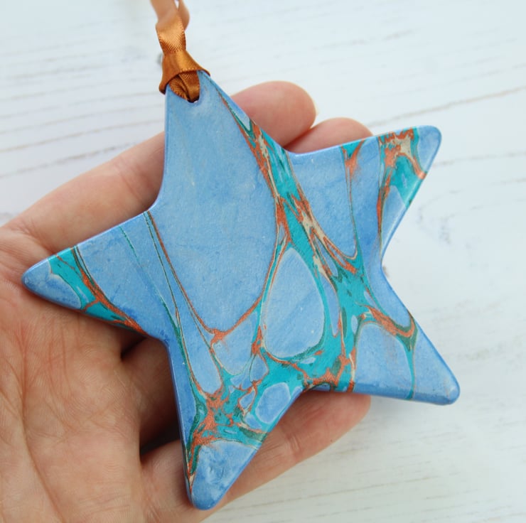These 10cm marbled flat ceramic stars are seconds, most with glaze faults (dust, trapped hair, scratches, dents or orange peel texture etc) which do not detract from the beauty of the piece but mean that they are not able to be sold at full price.