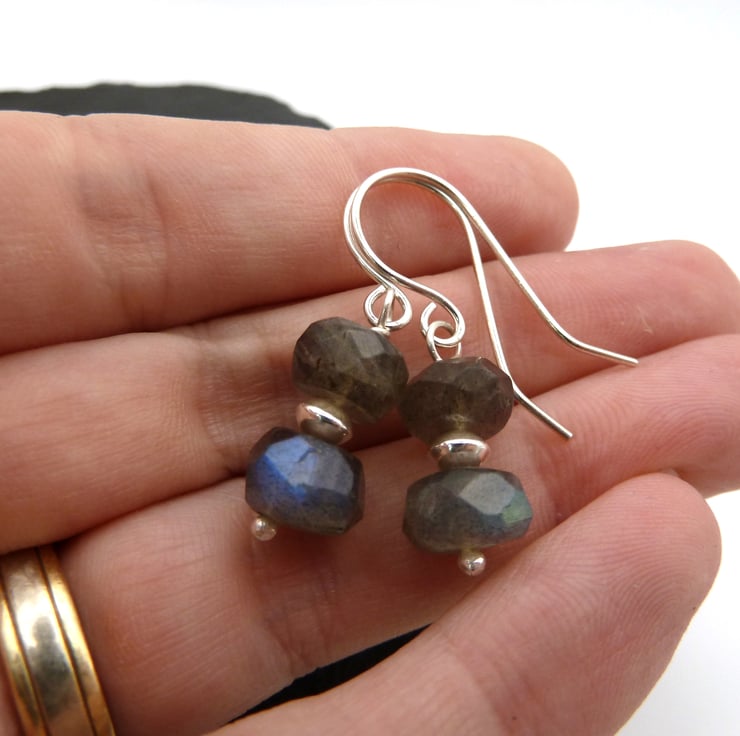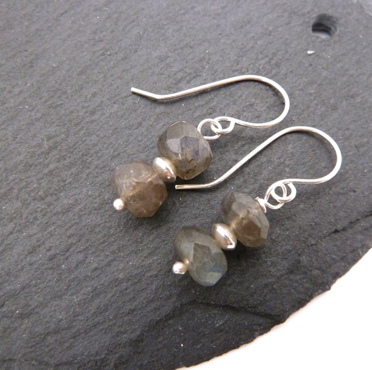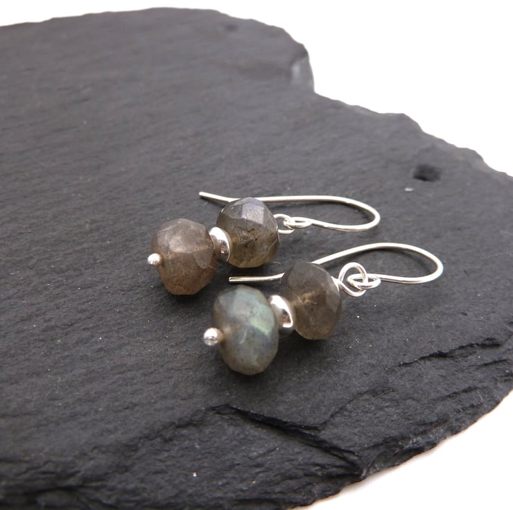A pair of earrings made using handmade sterling silver ear wires, sterling silver beads and Grade AA Labradorite gemstone beads.