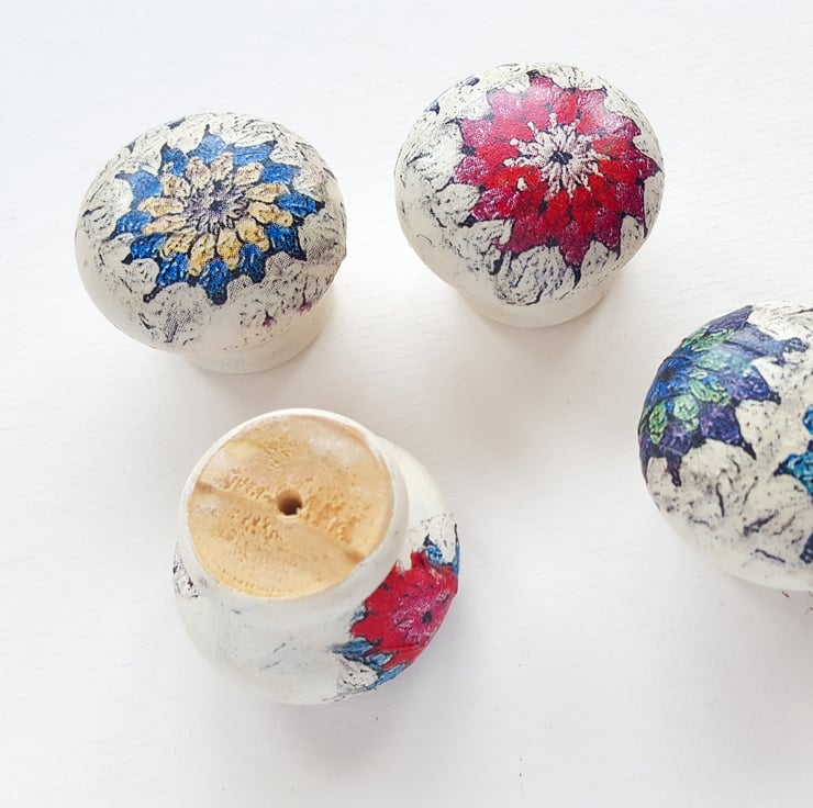 White wooden 4cm door knobs with crochet granny square decoupaged images