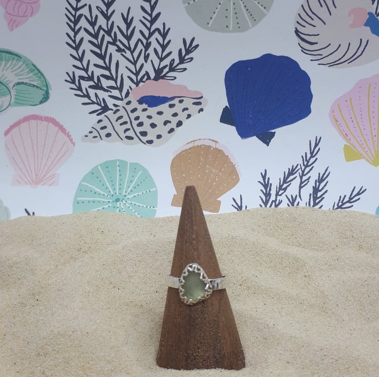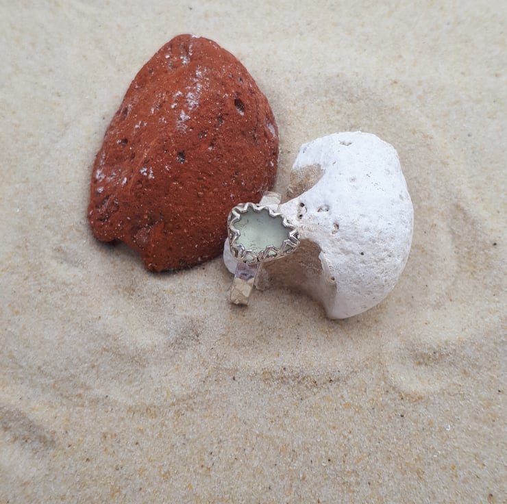 A piece of genuine UK sea glass (soft UV green) set in fine silver, on a sterling silver hammered band.