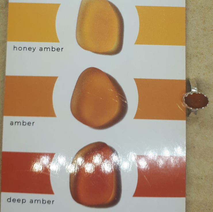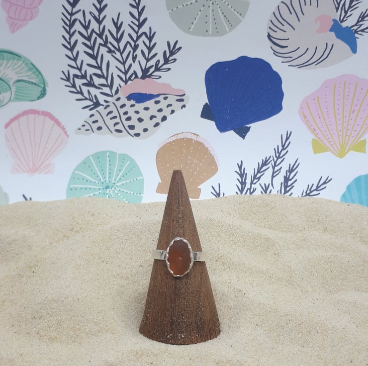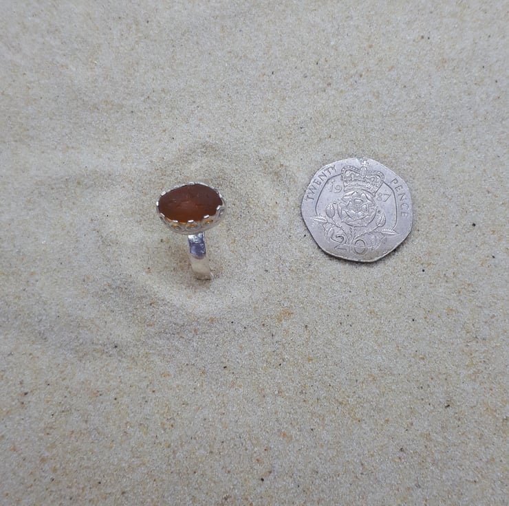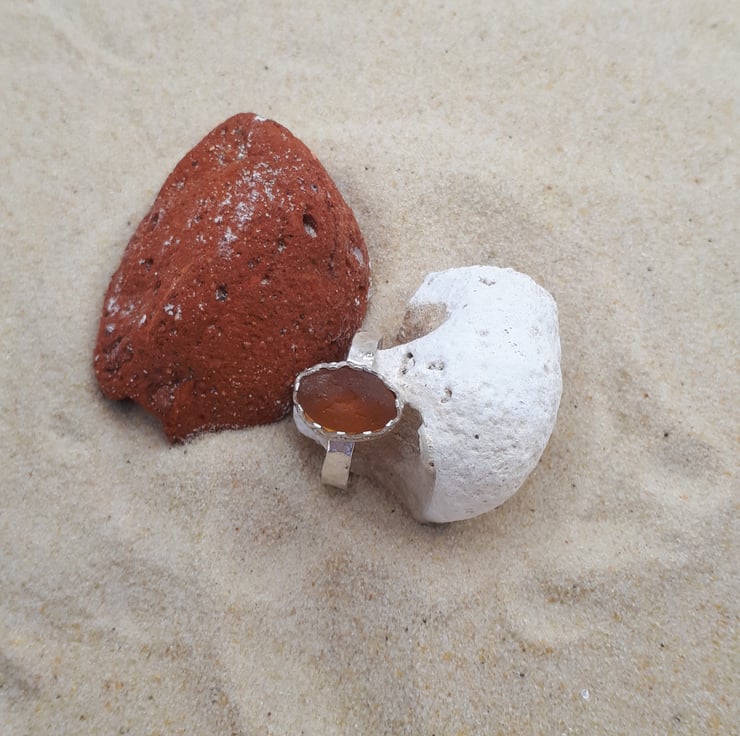 A piece of genuine UK sea glass (amber) set in fine silver, on a sterling silver hammered band.