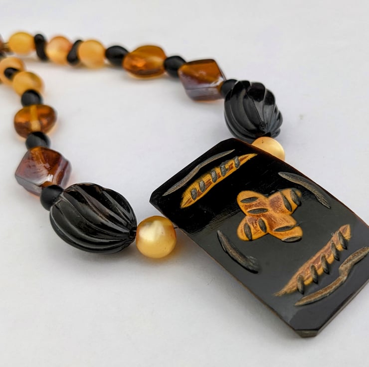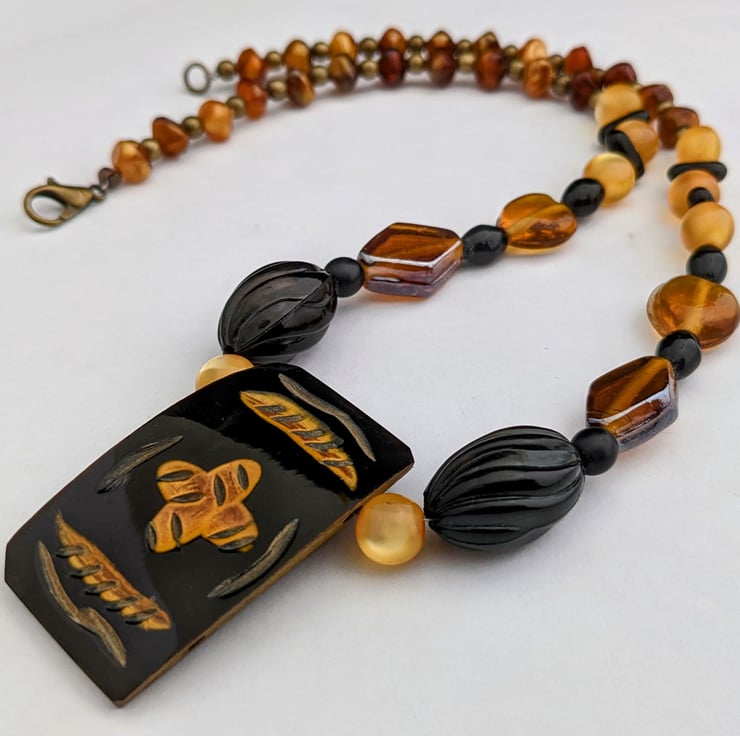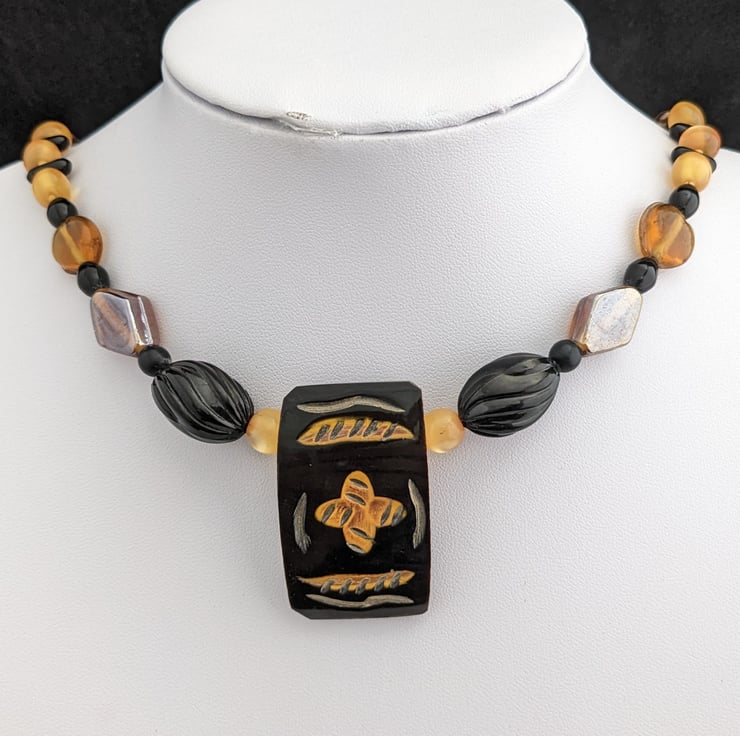 18" necklace of black, brown and orange glass and resin beads with bronze tone spacers and a 44x25mm ethnic pendant.