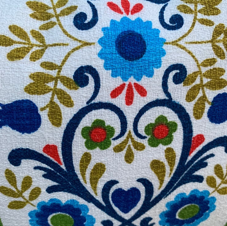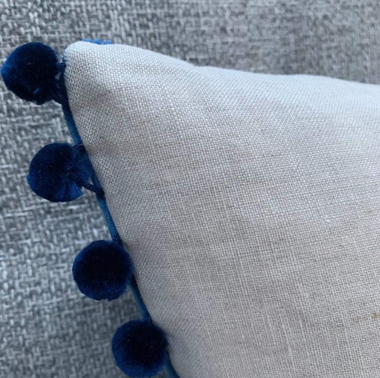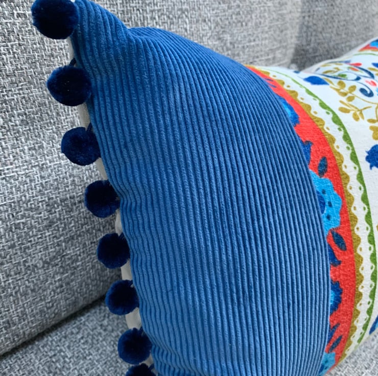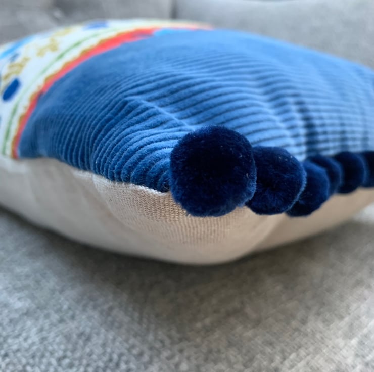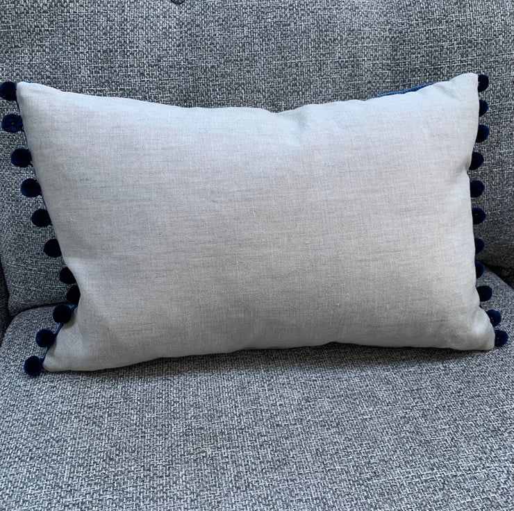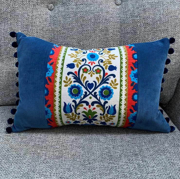 Striking feature cushion cover made from vintage barkcloth and matching blue corduroy trimmed with velvety pompoms and backed with natural linen.