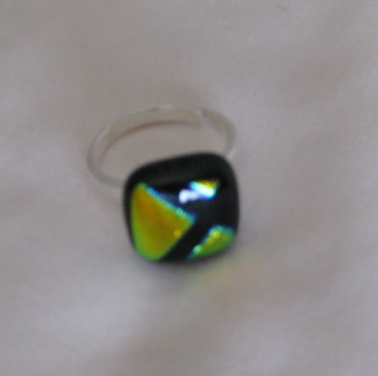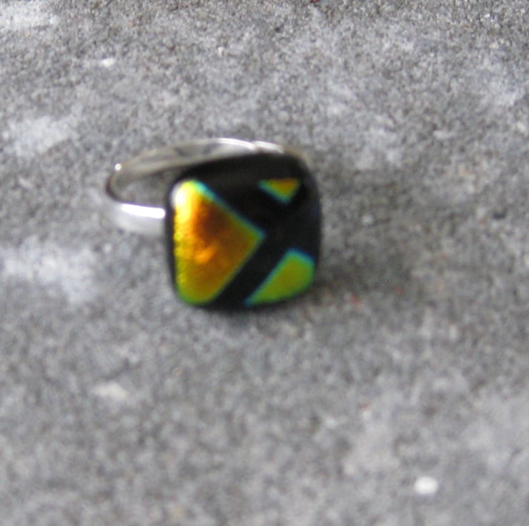 A very pretty fused dichroic glass - silver adjustable adult`s ring. Beautiful golden/orange top (12mm x 12mm) with slight blue and green tinges and a black cross design.