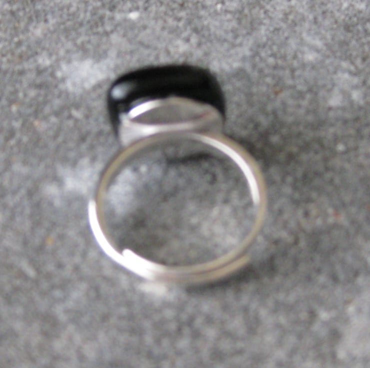Having already made several glass earrings and necklaces I decided to turn my hand to creating some pretty rings to further my collection. For the top of this piece I fused a vibrant golden/orange dichroic glass (square in shape) known as the stix design (with black criss-cross) onto a black Bullseye glass. I then fixed this onto an adjustable silver ring pad.