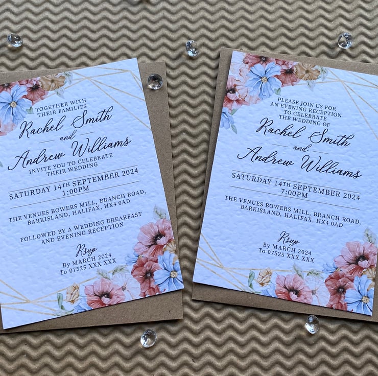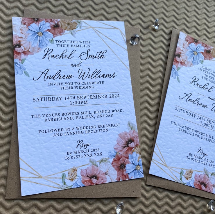WEDDING day or evening reception invites, cards, invitations, blush pink and blue flowers, gold geometric frame, rustic wedding theme design.