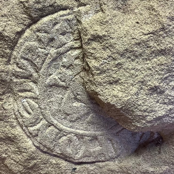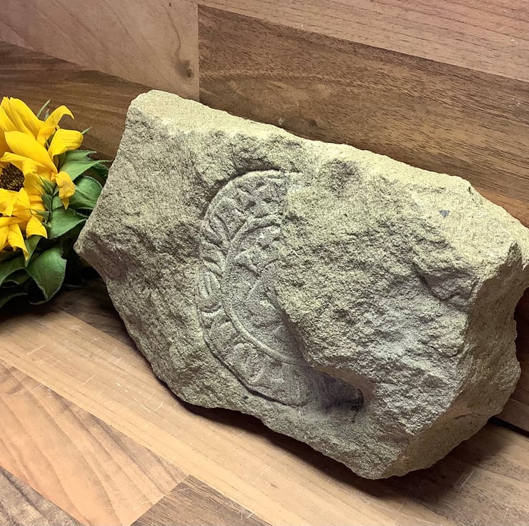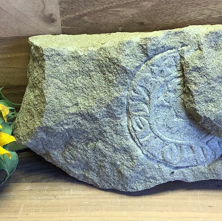 This unique, one off piece of art, is hand carved using traditional methods with hammer and chisel. It is made from a reclaimed piece of stone from a local quarry which is dark and weathered around the edges. I love the definition of the carved coin against the rough background and the effect of the partly revealed coin still in the ground.