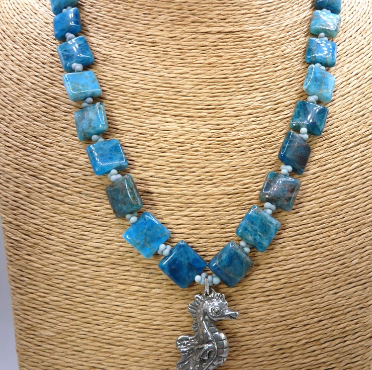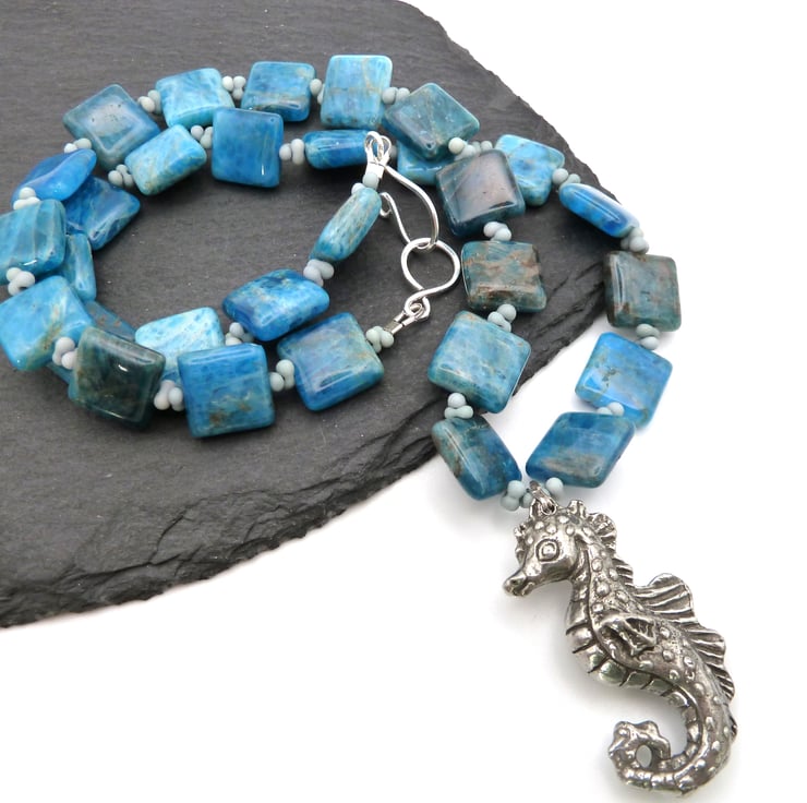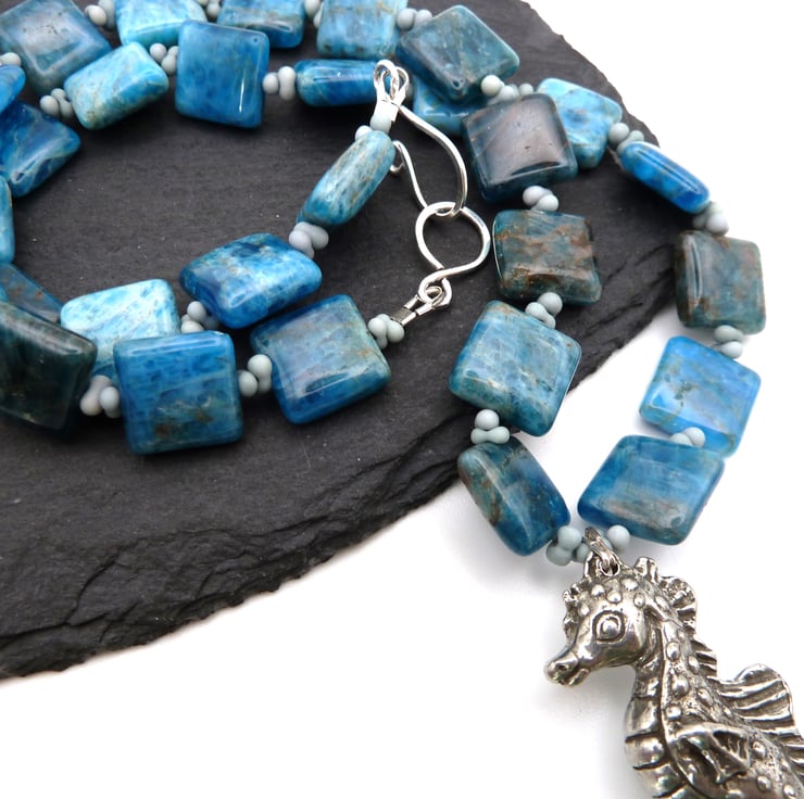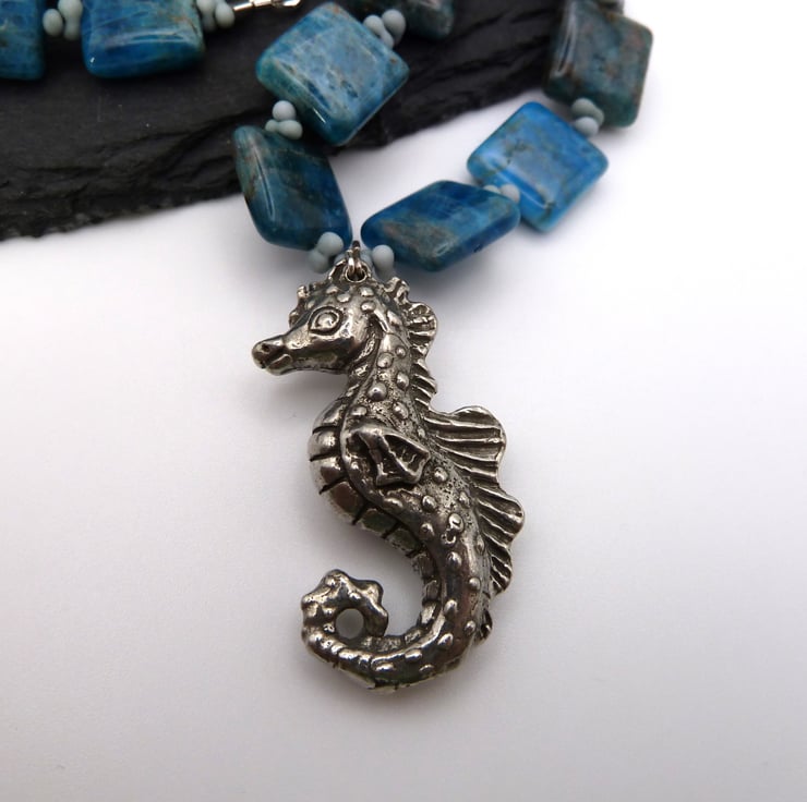 A necklace made using Apatite gemstone beads and a handmade pewter seahorse pendant. The necklace fastens with a handmade sterling silver hook.