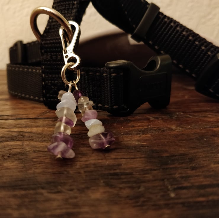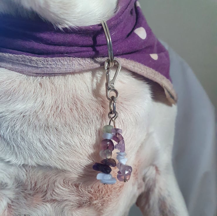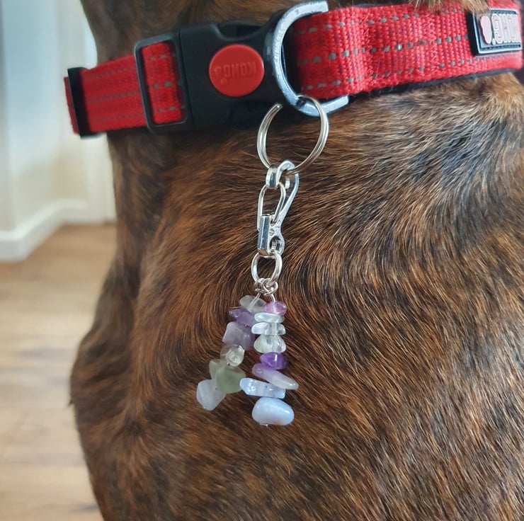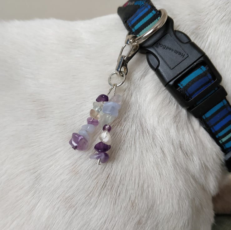 A lot of my dog clients are senior dogs who need a little help with joint pain, and muscular pain from compensatory issues, so I chose crystals to help with this, and came up with this pretty collar charm.