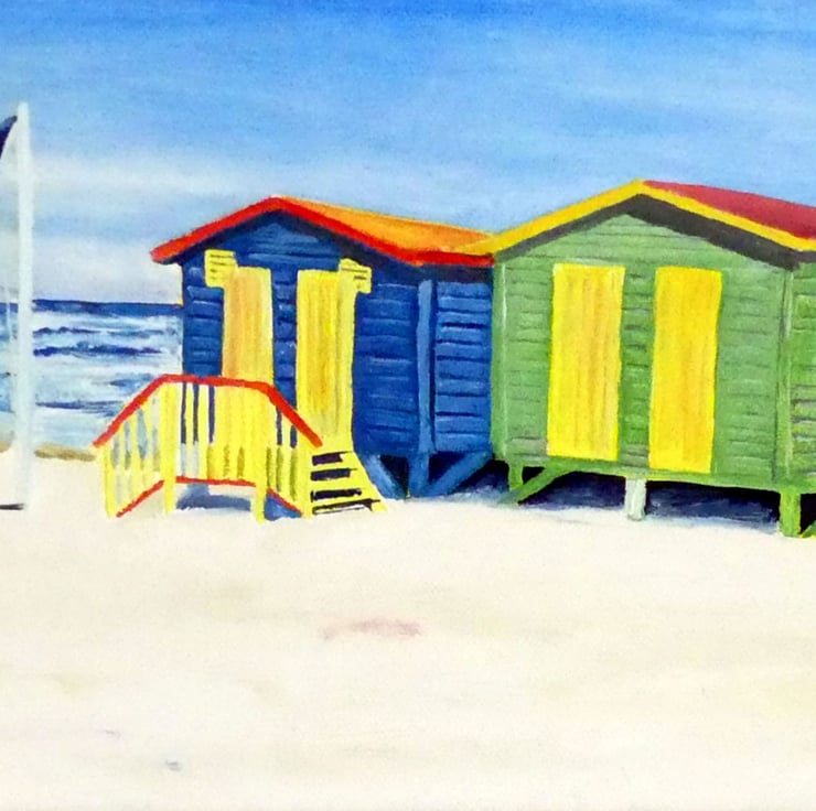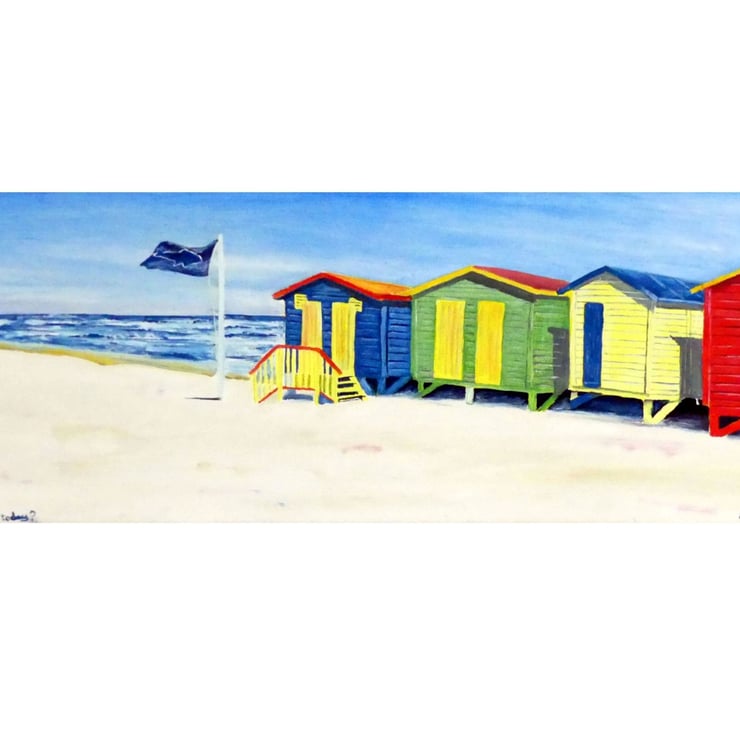 The wind is whipping up the waves at Surfers' Corner, Muizenberg Beach, Cape Town South Africa. This work bears witness to the painter who selected the juxtaposition of colours of these beach huts.