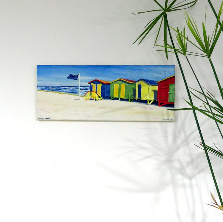 The wind is whipping up the waves at Surfers' Corner, Muizenberg Beach, Cape Town South Africa. This work bears witness to the painter who selected the juxtaposition of colours of these beach huts.