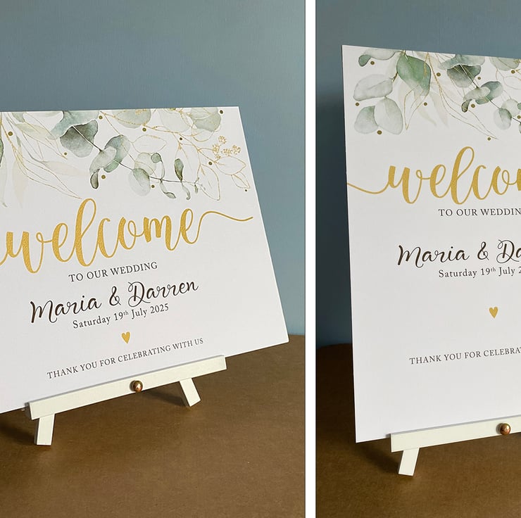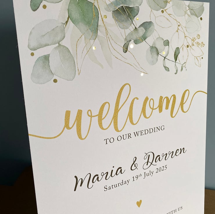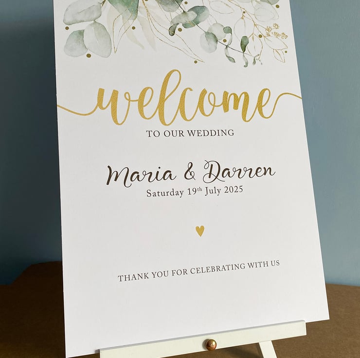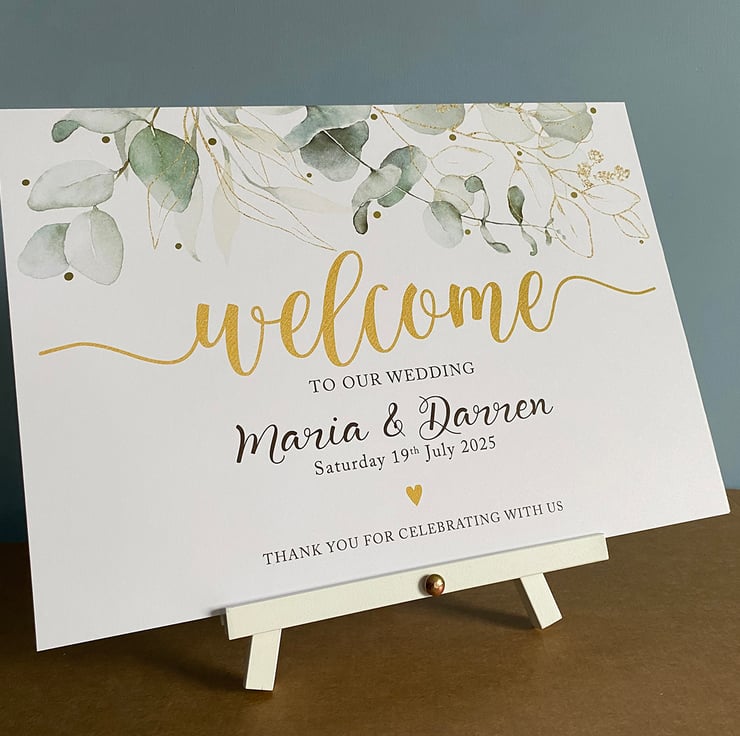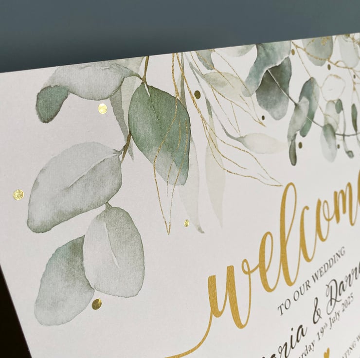 Personalised WELCOME to the WEDDING sign in A3, A2 and A1 size, simple eucalyptus leaves greenery, golden leaves outline, rustic wedding theme design. Decorated with metallic gold polka dots (see pictures).