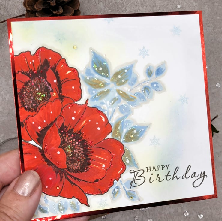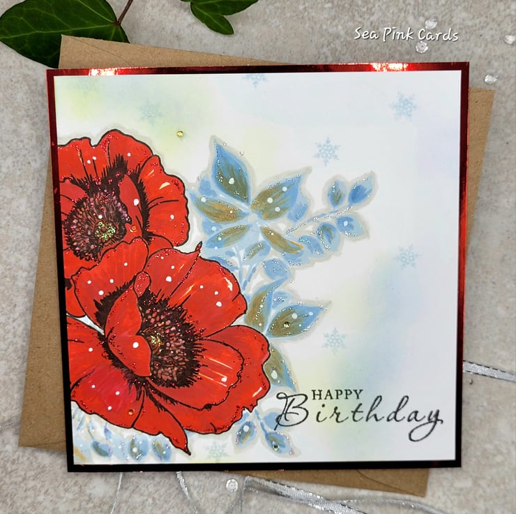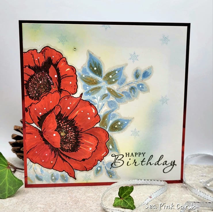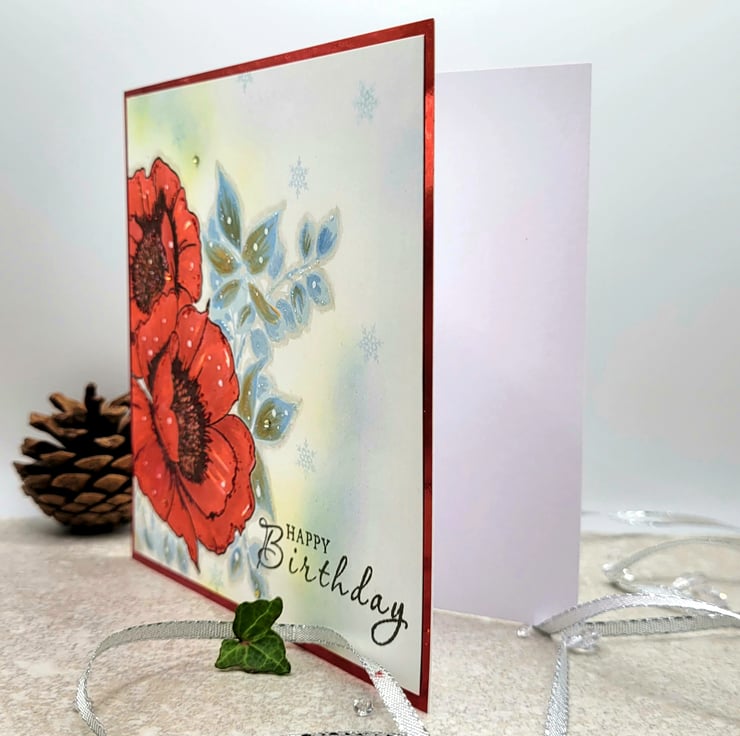 The card base is handmade from white recycled card, with a red layer of mirror card. There are two winter blooms coloured to give depth and texture, by using several shades of red Windsor and Newton ProBrush Markers. The branches and leaves are coloured in soft sage green, blue and grey. There is a simple sentiment on the front which says HAPPY BIRTHDAY. Details added with tiny amounts of non-toxic no-shedding glitter glue and white paint pen. The inside of the card is plain white and blank for writing your own message or greeting.