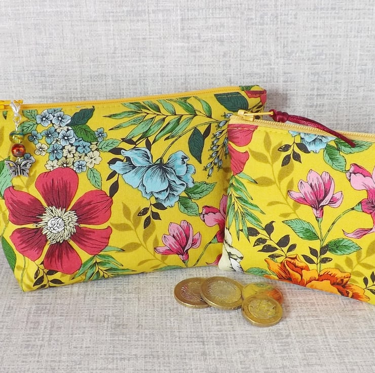 The main fabric has a floral design in shades of pink, orange, red & blue on a golden yellow background. The lining is a golden yellow cotton with a tonal design.