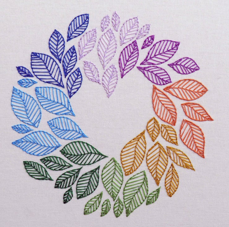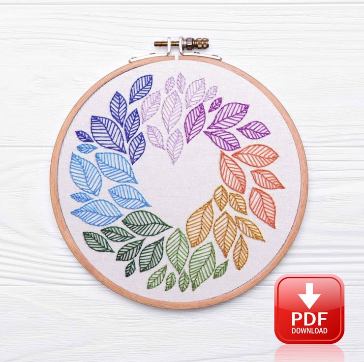 Lose yourself in this nature-inspired embroidery design stitching gorgeous colored leaves around into a wheel of color and forming a wonderful heart in the center. A perfect beginner embroidery design or a nice simple design for the more experienced stitcher.