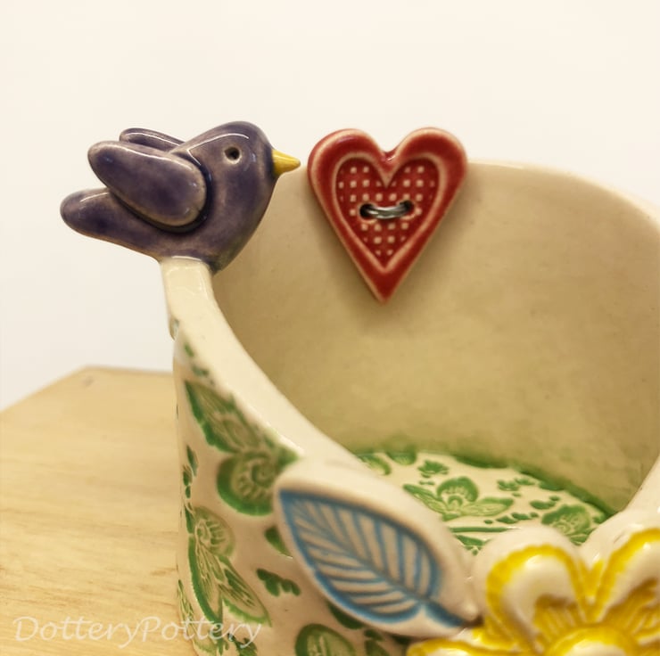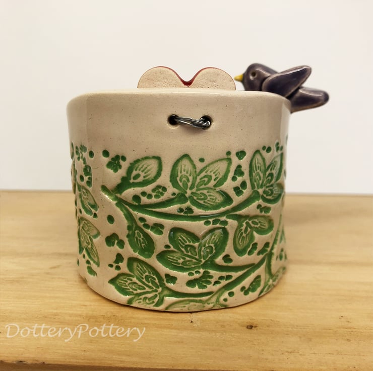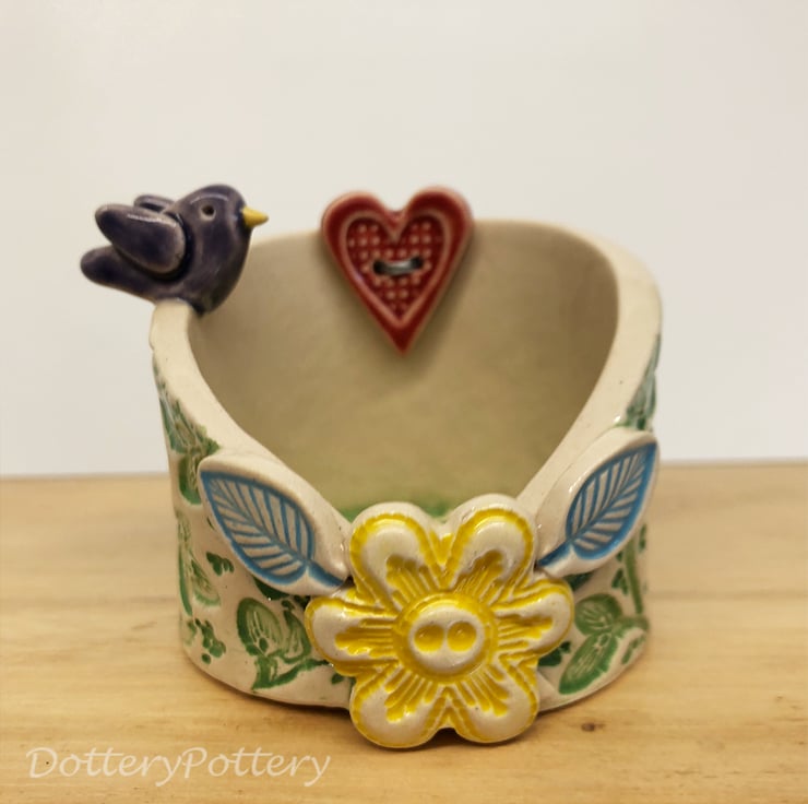 This decorative little candle holder is made from white earthenware clay.It is decorated with a leafy and floral pattern and then fired once. It is finished with a little bird and a heart attached with silver coloured wire. It is then glazed with a clear glaze and fired again to a top temperature of 1100 degrees, so it is nice and strong. Perfect as a tealight holder or little trinket dish. It measures 5cm high by 6.5cm diameter. Please double check dimensions and refer to photographs for size.