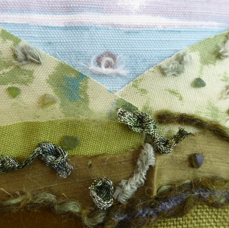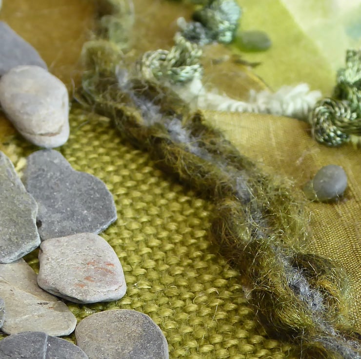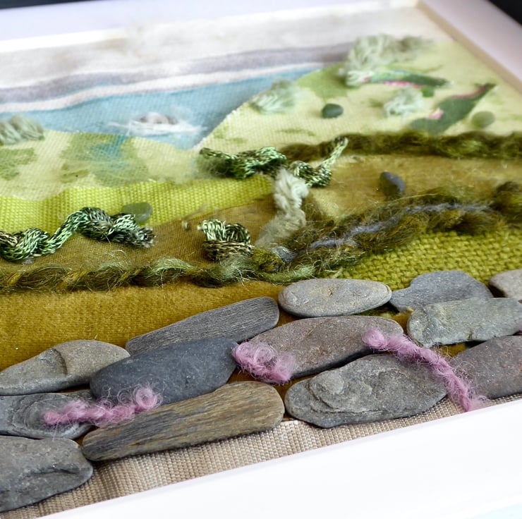 Made with pebbles and sea glass from the actual cove alongside fabric remnants.