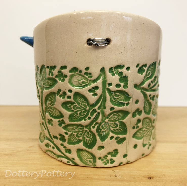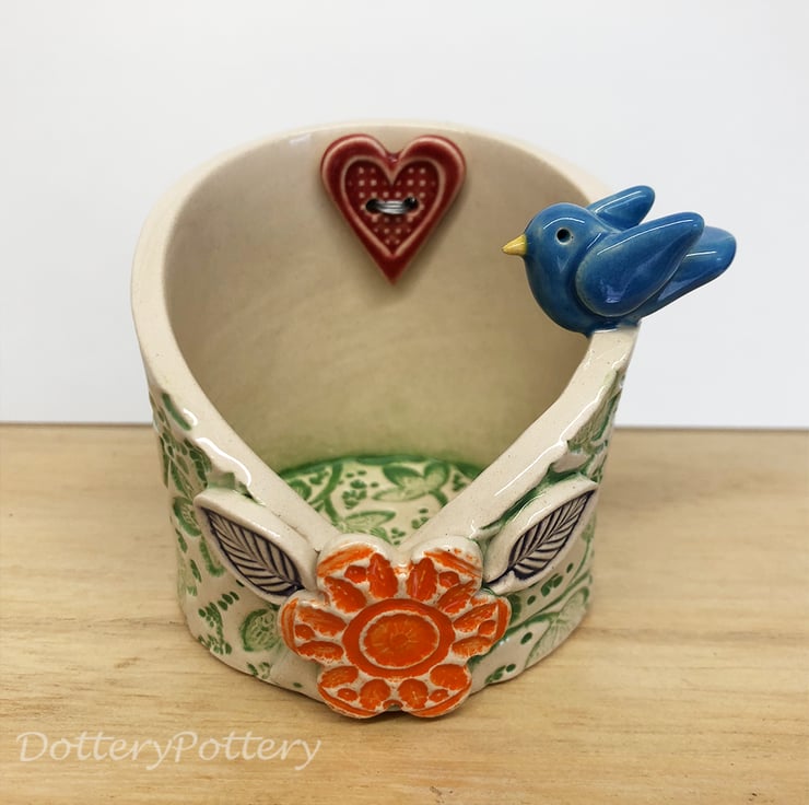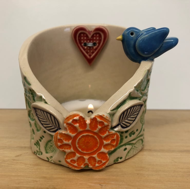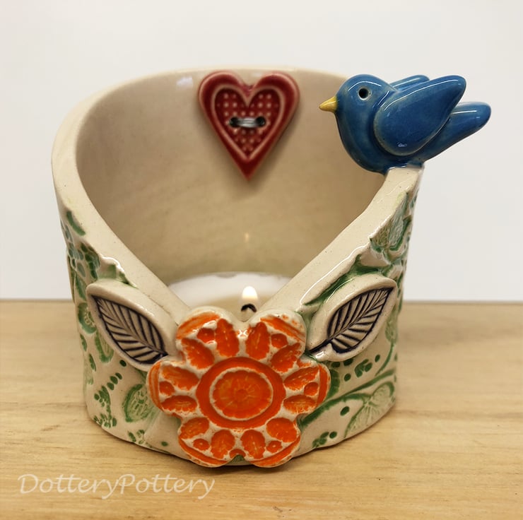 This decorative little candle holder is made from white earthenware clay.It is decorated with a leafy and floral pattern and then fired once. It is finished with a little bird and a heart attached with silver coloured wire. It is then glazed with a clear glaze and fired again to a top temperature of 1100 degrees, so it is nice and strong. Perfect as a tealight holder or little trinket dish. It measures 6cm high by 7cm diameter. Please double check dimensions and refer to photographs for size.
