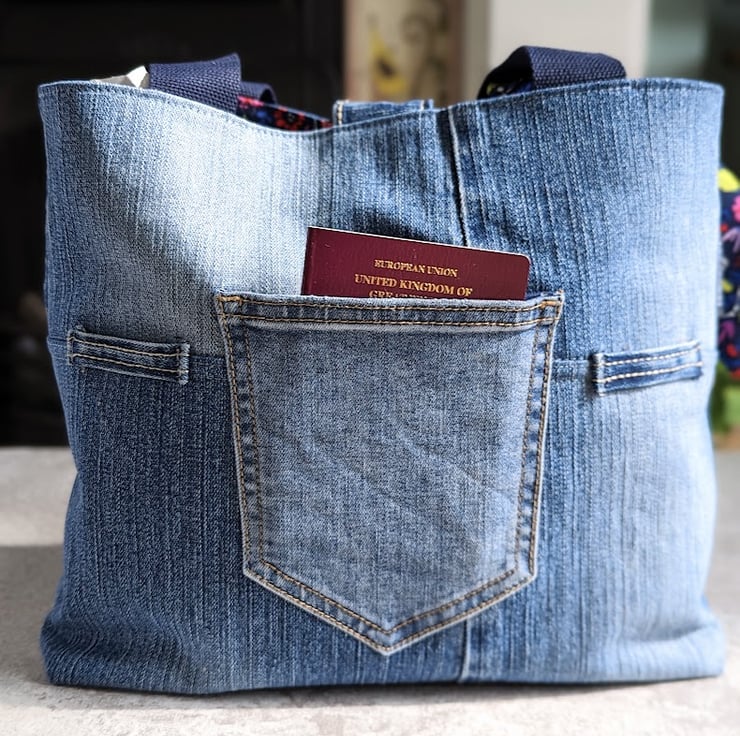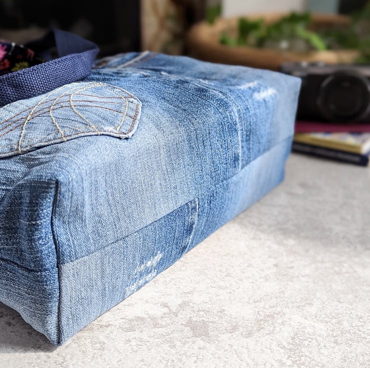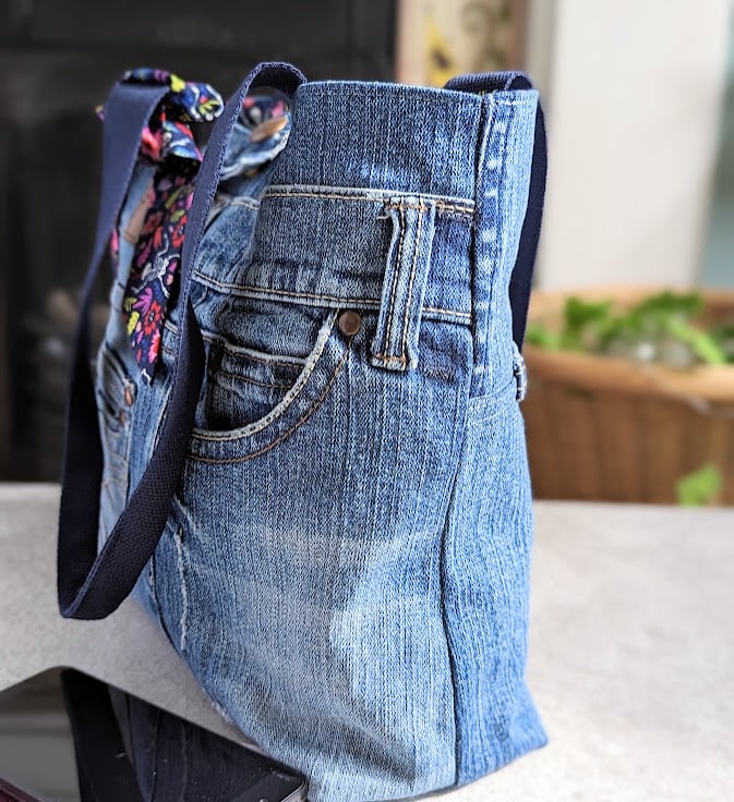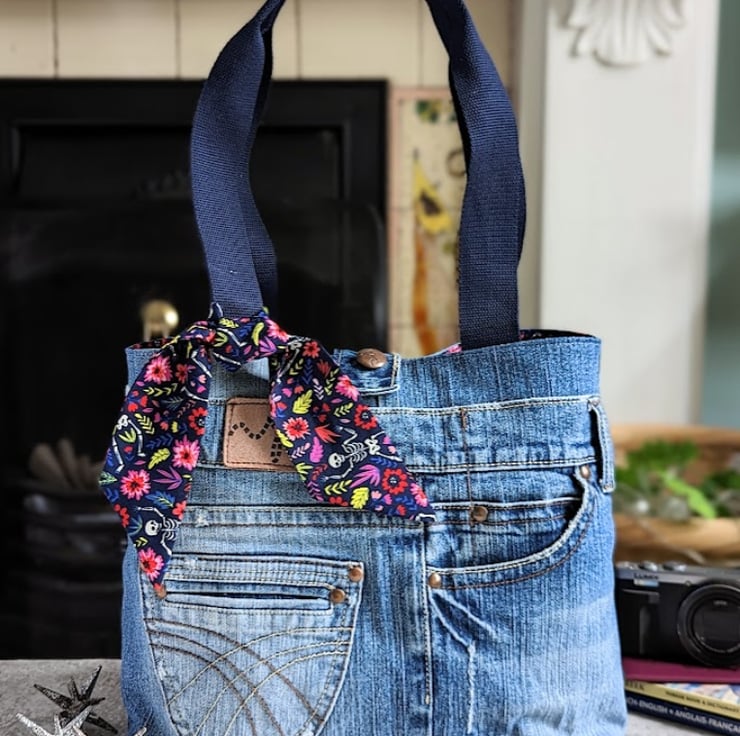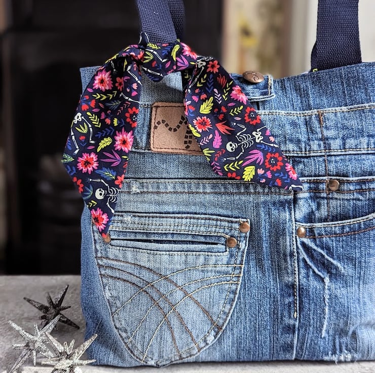 This upcycled denim grab tote bag has been handmade using faded, pre-loved denim jeans. It has a quirky but pretty flower and skeleton print lining and navy blue grab handles. A matching, removable tie decorates the front of the bag giving it an uplifting, stylish feel