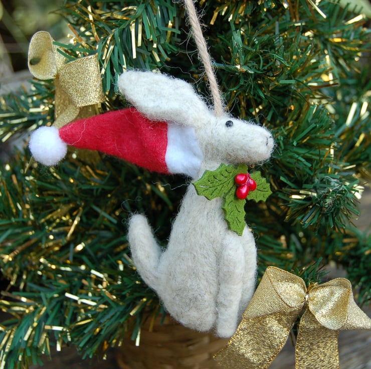 A cute Christmas Tree bauble. A moon gazing hare made from unspun wool fibres wearing a red Santa hat. The hare is available in either winter White or Grey. Choose from the drop down list.
