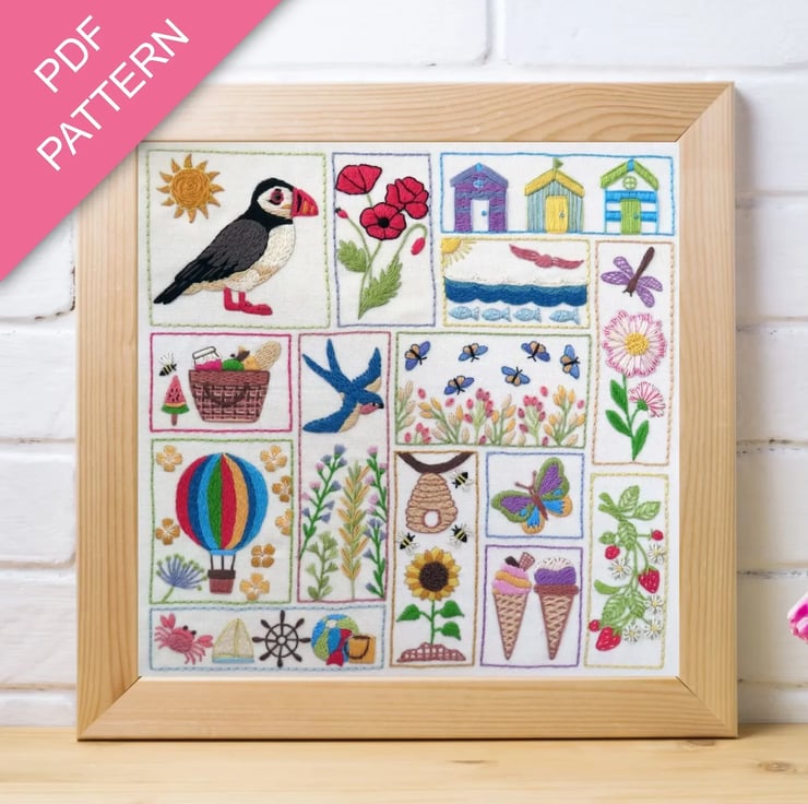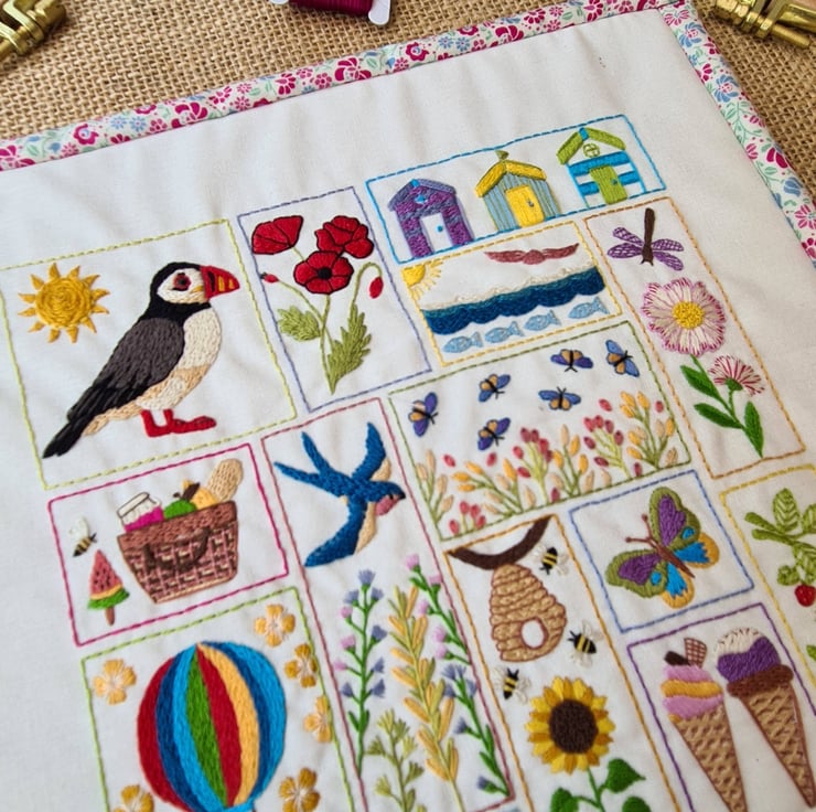 There are lots of bright and summery elements featured in the design which you can enjoy bringing to life with a variety of different hand embroidery stitches allowing you to create a modern sampler with a traditional feel.