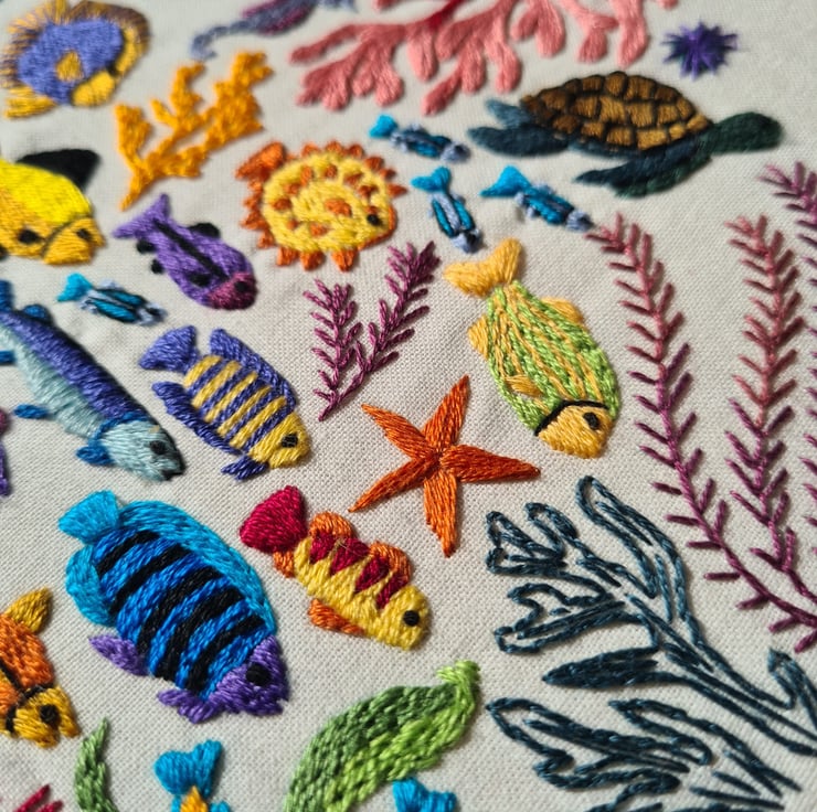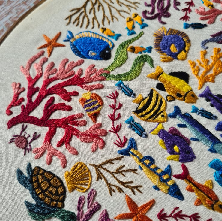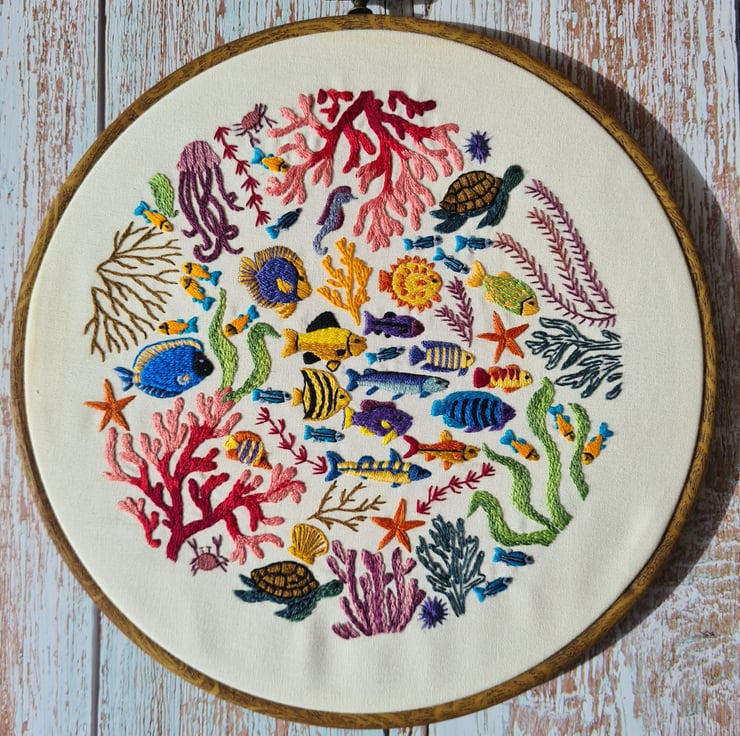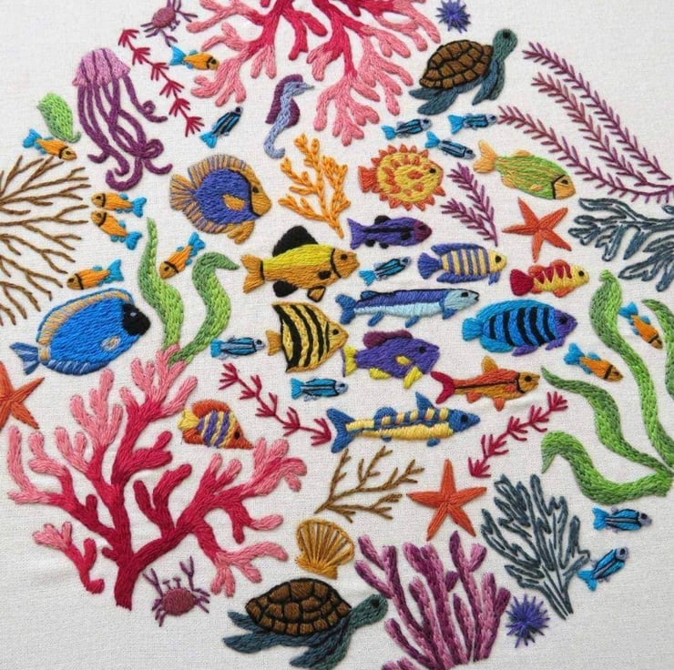 This Ocean Wonders, Hand Embroidery Pattern design has a lot going on and is incredibly fun to stitch , the modern embroidery sampler will allow you to escape under the sea every time you stitch and comes to life one stitch at a time.