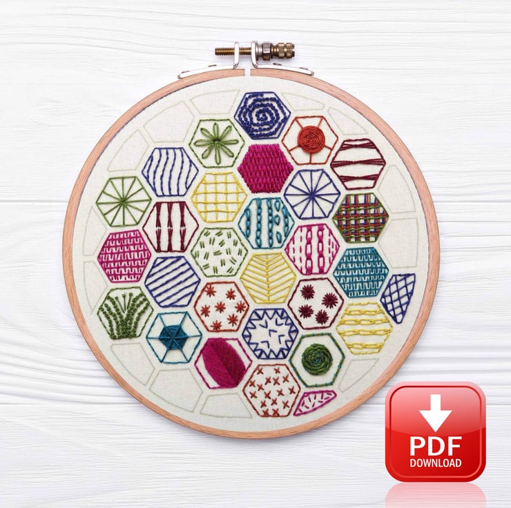 This hexagon embroidery sampler has been designed for beginners to create a fabulous pattern whilst learning 20 hand embroidery stitches. This is a wonderful way to learn and start you on your embroidery journey.