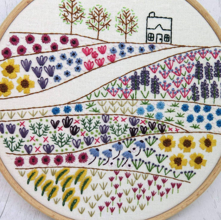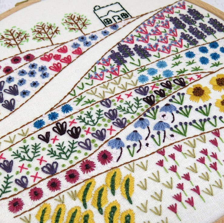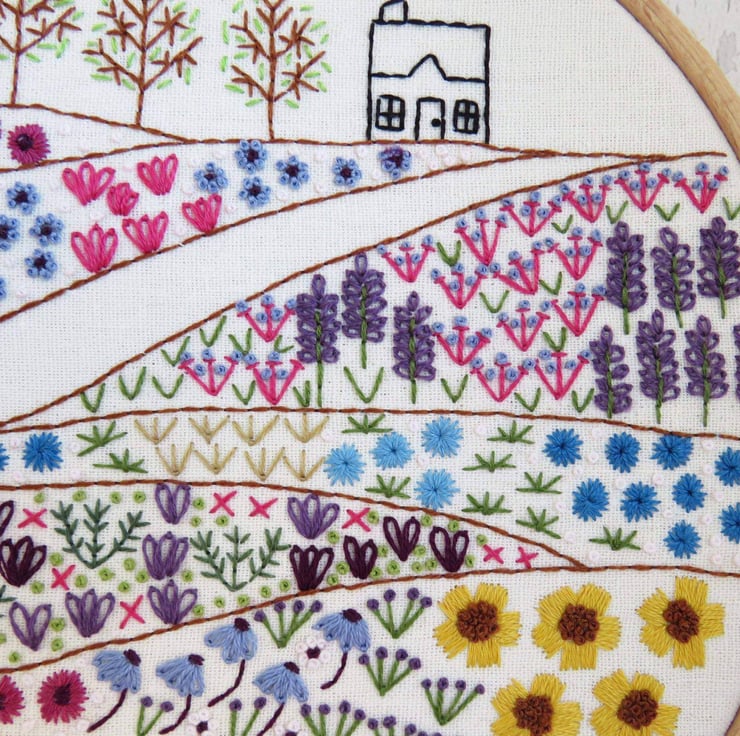 Flower Meadow Cottage Hand Embroidery Pattern - a beautiful Hand Embroidery design where you can get lost in all the gorgeous colours and stitches found in the meadows that lead to the cottage.