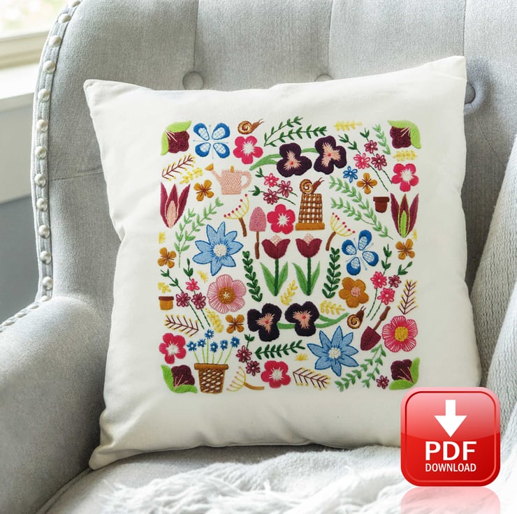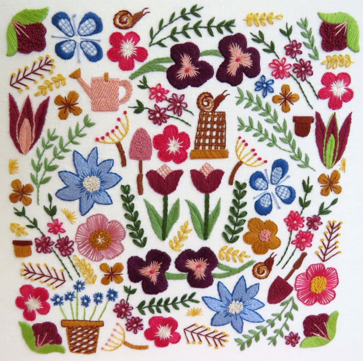There are an abundance of flowers to explore including Tulips, Pansies and Daisies which are intermingled with foliage, pots and snails! A Hand Embroidery Sampler to keep you smiling the whole way through.