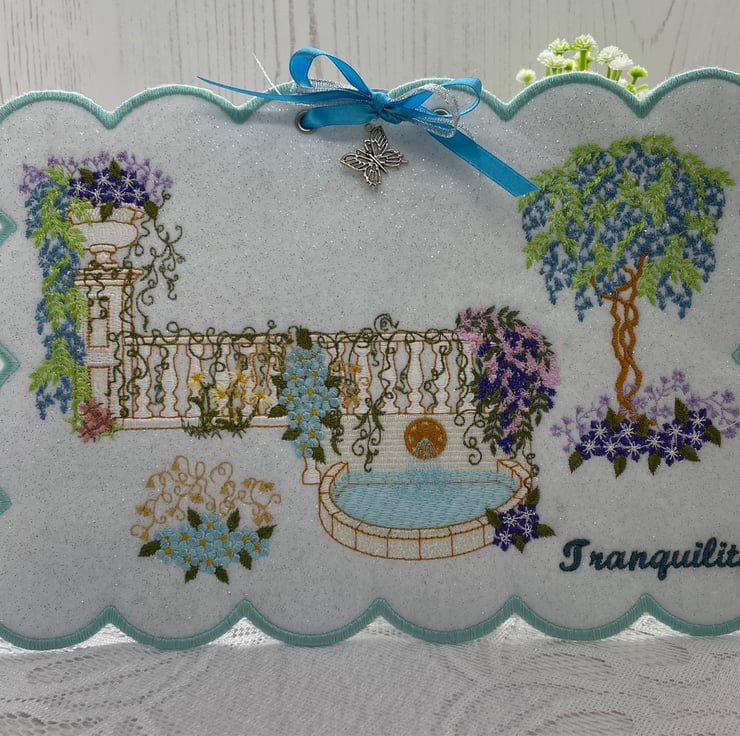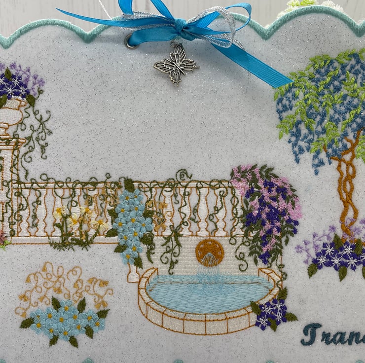 A beautiful garden setting, stitched onto white felt with a hint of glitter. Depicting a tranquility garden. Silver eyelets hold turquoise and silver ribbon in a bow and forming a hanging loop. A butterfly charm added for detail.