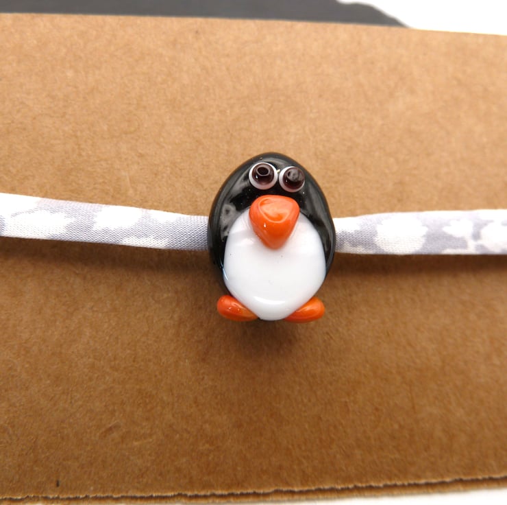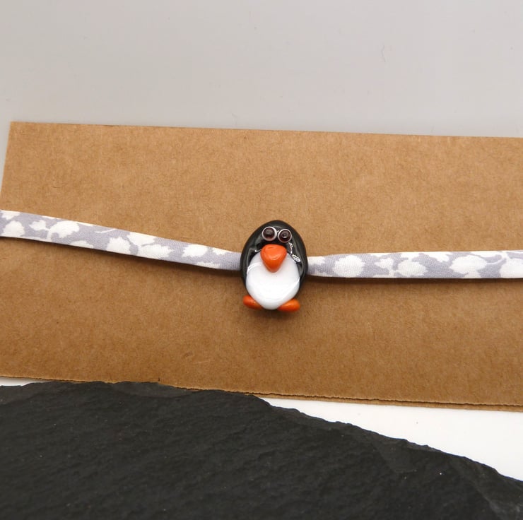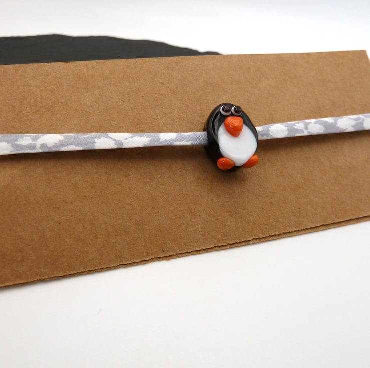 A bracelet made with liberty print fabric and featuring a handmade lampwork glass penguin bead.